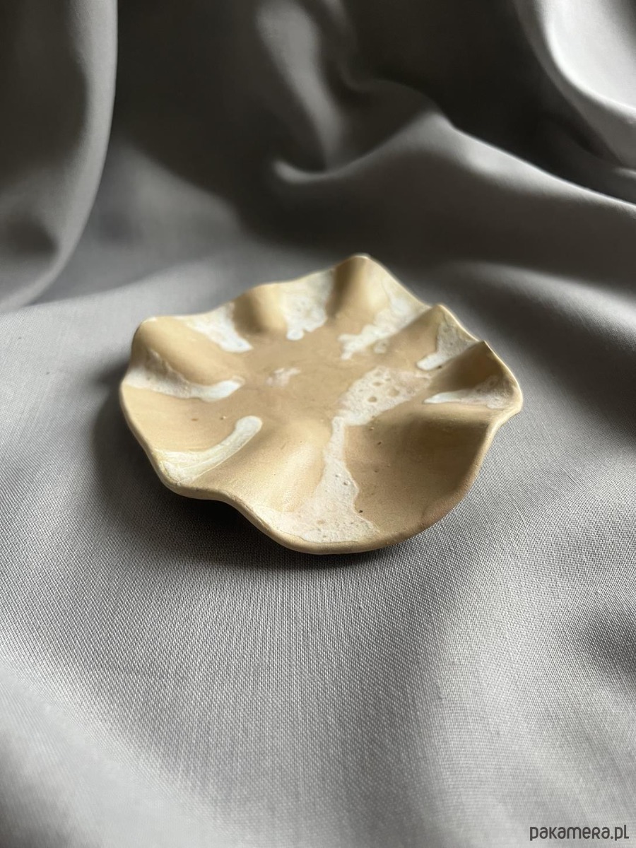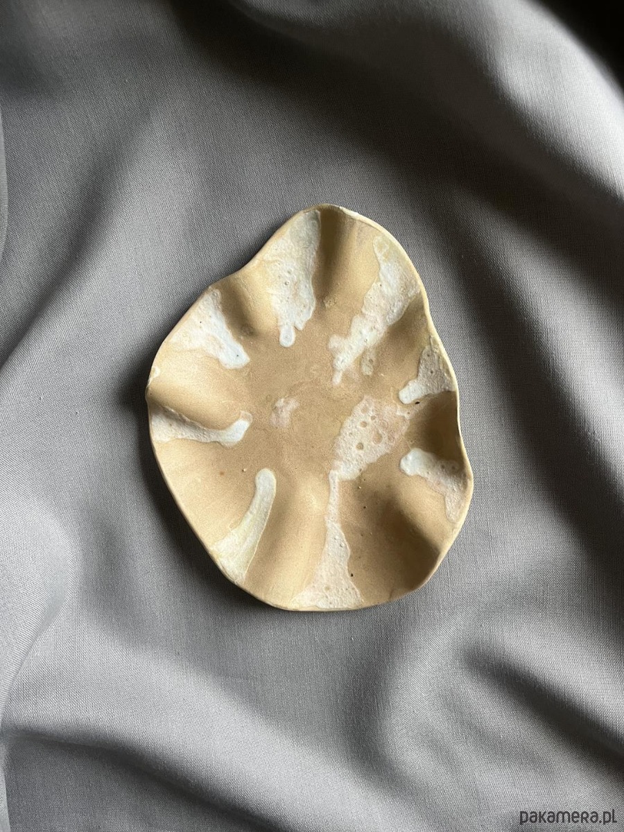 Talerzyk ceramiczny wykonany 100% ręcznie z płata jasnej gliny, forma organiczna, nieregularna, pokryty szkliwami w odcieniach bieli i beżu.