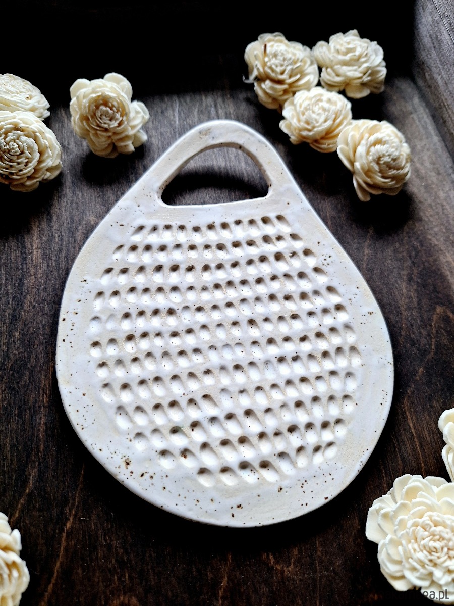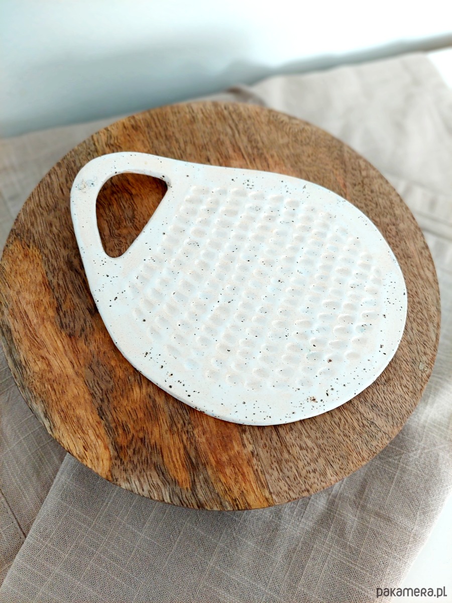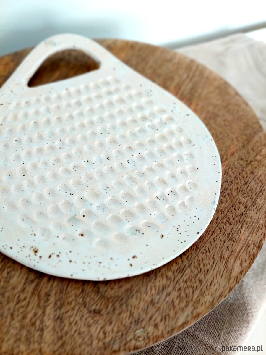 Ceramiczna podstawka w kształcie deski kuchennej. Dekoracja w błyszczącym kolorze ecru z uwidocznionymi wgłębieniami. Końcówka z otworem umożliwiającym zawieszenie ozdoby na ścianie. Drobny upominek dla miłośnika gotowania, świetnie uzupełniamy aranżację kuchenną.
