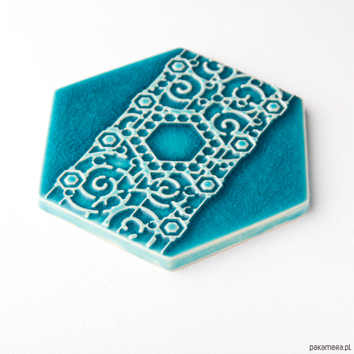 Ceramiczna podstawka (talerzyk) w kształcie heksagonu, pod kubek, filiżankę, świece itp. z ozdobnym lekko wypukłym koronkowym ornamentem. Ręcznie wykonana z jasnej gliny, ręcznie szkliwiona. Odporna na wodę, ścieranie, wysokie i niskie temperatury.