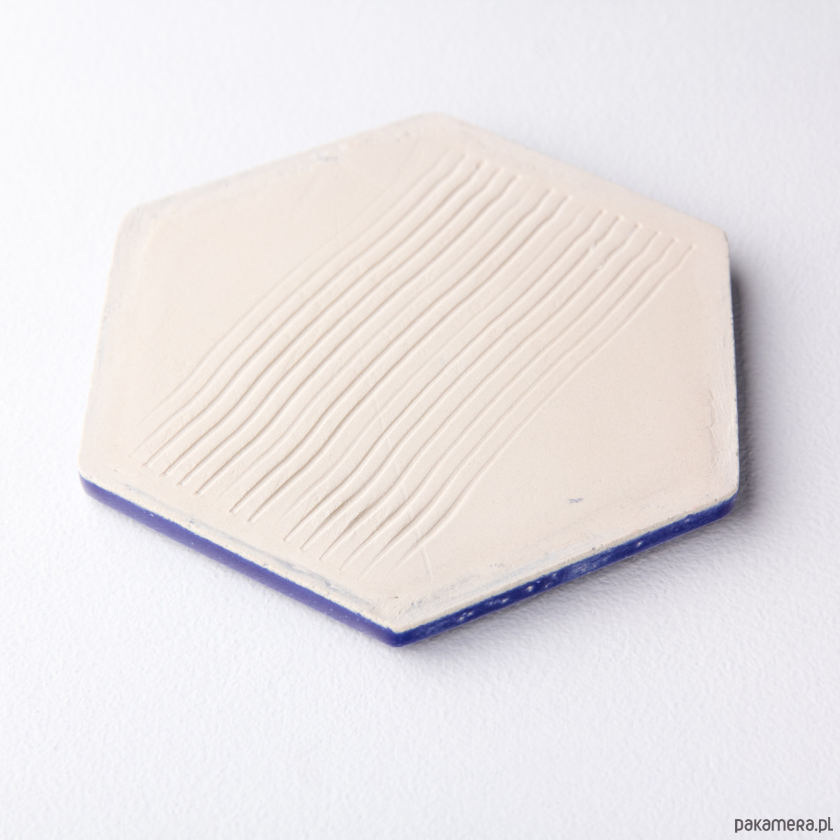 Ceramiczna podstawka (talerzyk) w kształcie heksagonu, pod kubek, filiżankę, świece itp. z ozdobnym lekko wypukłym koronkowym ornamentem. Ręcznie wykonana z jasnej gliny, ręcznie szkliwiona. Odporna na wodę, ścieranie, wysokie i niskie temperatury.