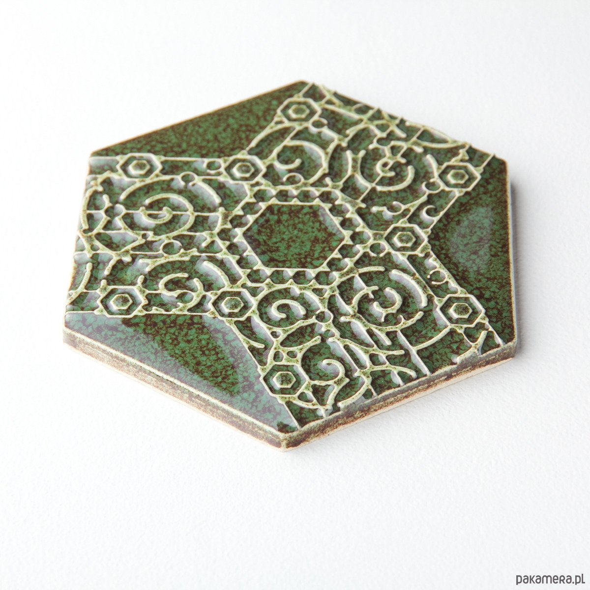 Ceramiczna podstawka (talerzyk) w kształcie heksagonu, pod kubek, filiżankę, świece itp. z ozdobnym lekko wypukłym koronkowym ornamentem. Ręcznie wykonana z jasnej gliny, ręcznie szkliwiona. Odporna na wodę, ścieranie, wysokie i niskie temperatury.