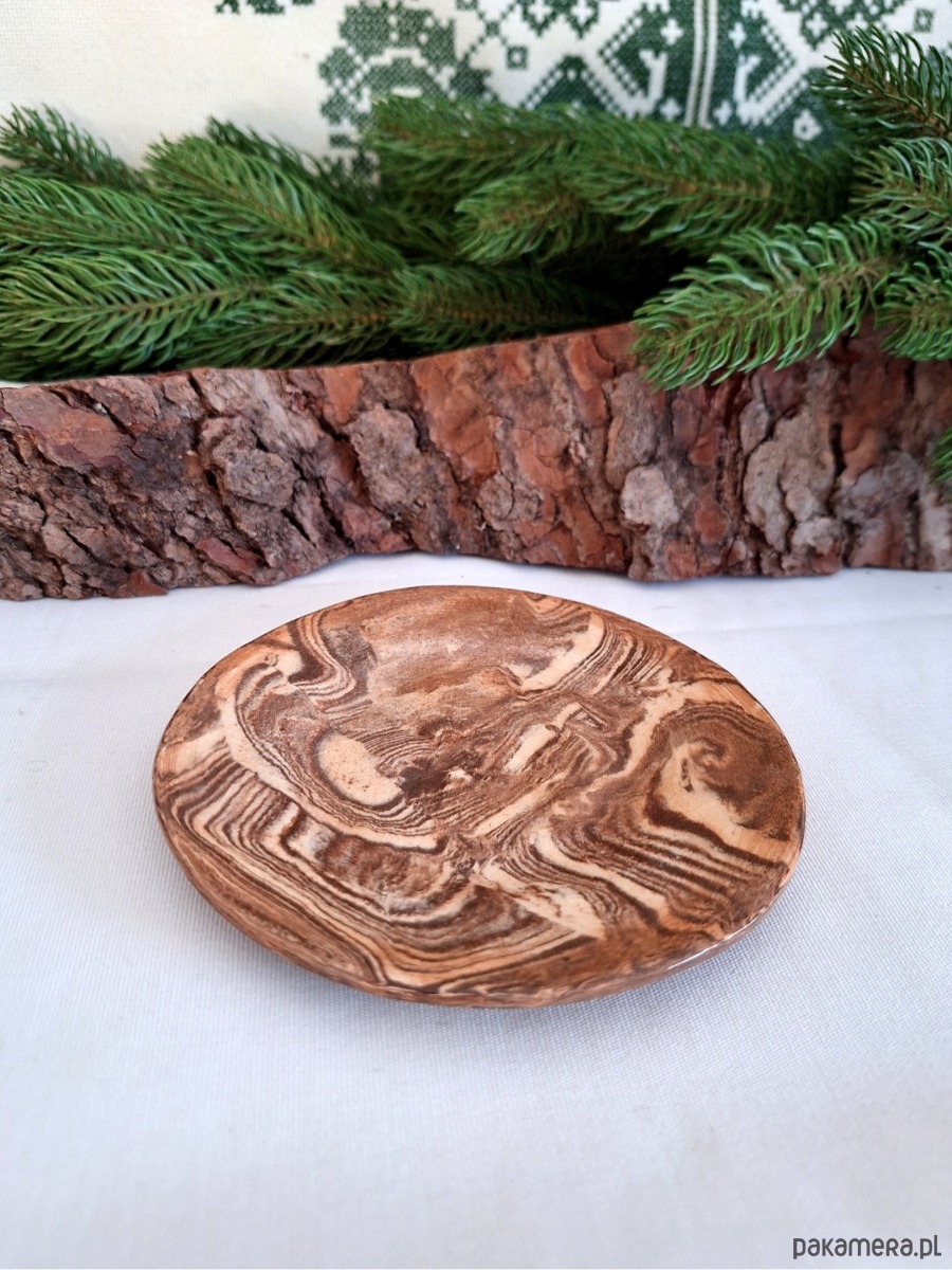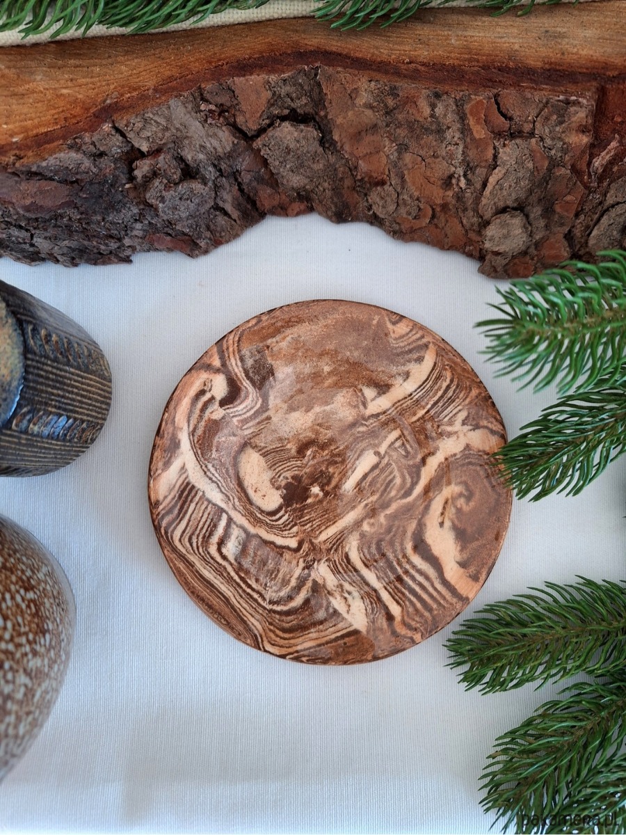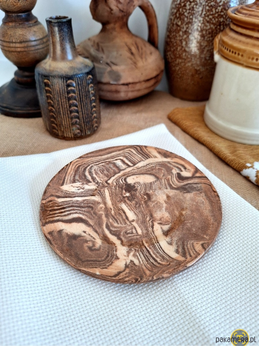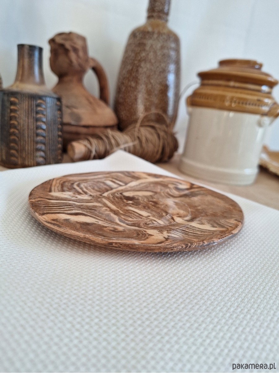 Ceramiczna dekoracja o wszechstronnym zastosowaniu – może służyć jako podstawka pod biżuterię, świece, klucze, szklanki, kadzidła i palo santo. Może również służyć jako talerz dekoracyjny czy oryginalna dekoracja ścienna. Ręcznie formowana i szkliwiona dekoracja powstaje poprzez połączenie kilku kolorów masy ceramicznej i ułożenie ich w fantazyjne, abstrakcyjne kształty. Dostępna w kolorze beżowym i brązowym z połyskiem. Co ciekawe, tej wyjątkowej i oryginalnej dekoracji nie da się wykonać identycznych egzemplarzy.Unikatowa i niepowtarzalna ozdoba.
