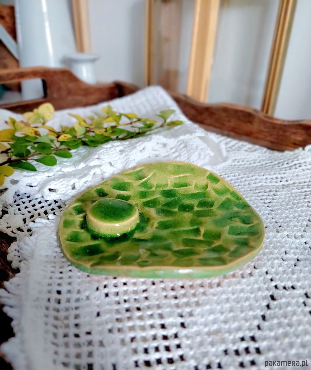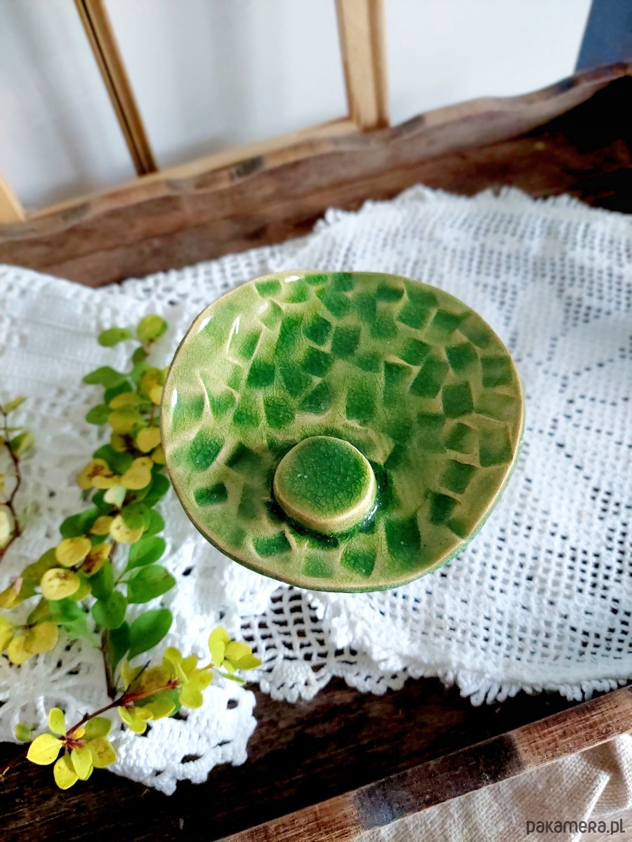 Ozdoba ręcznie formowana i szkliwiona, w glebokim błyszczą zielonym kolorze.