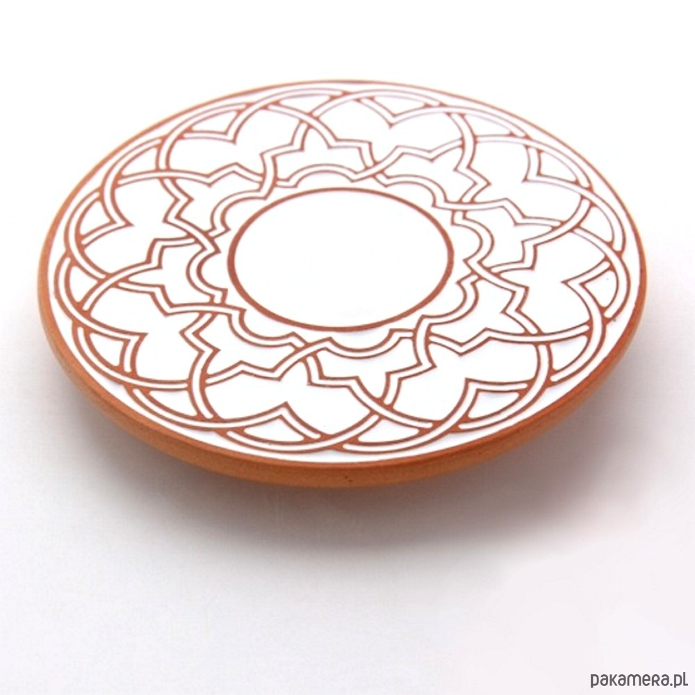 Ceramiczna podstawka z geometrycznym, lekko wypukłym ornamentem. Ręcznie wykonana z ciemnej gliny i ręcznie szkliwiona. Zastosowanie jako talerzyk pod kubek, filiżankę, świece, pod gorące naczynie itp.