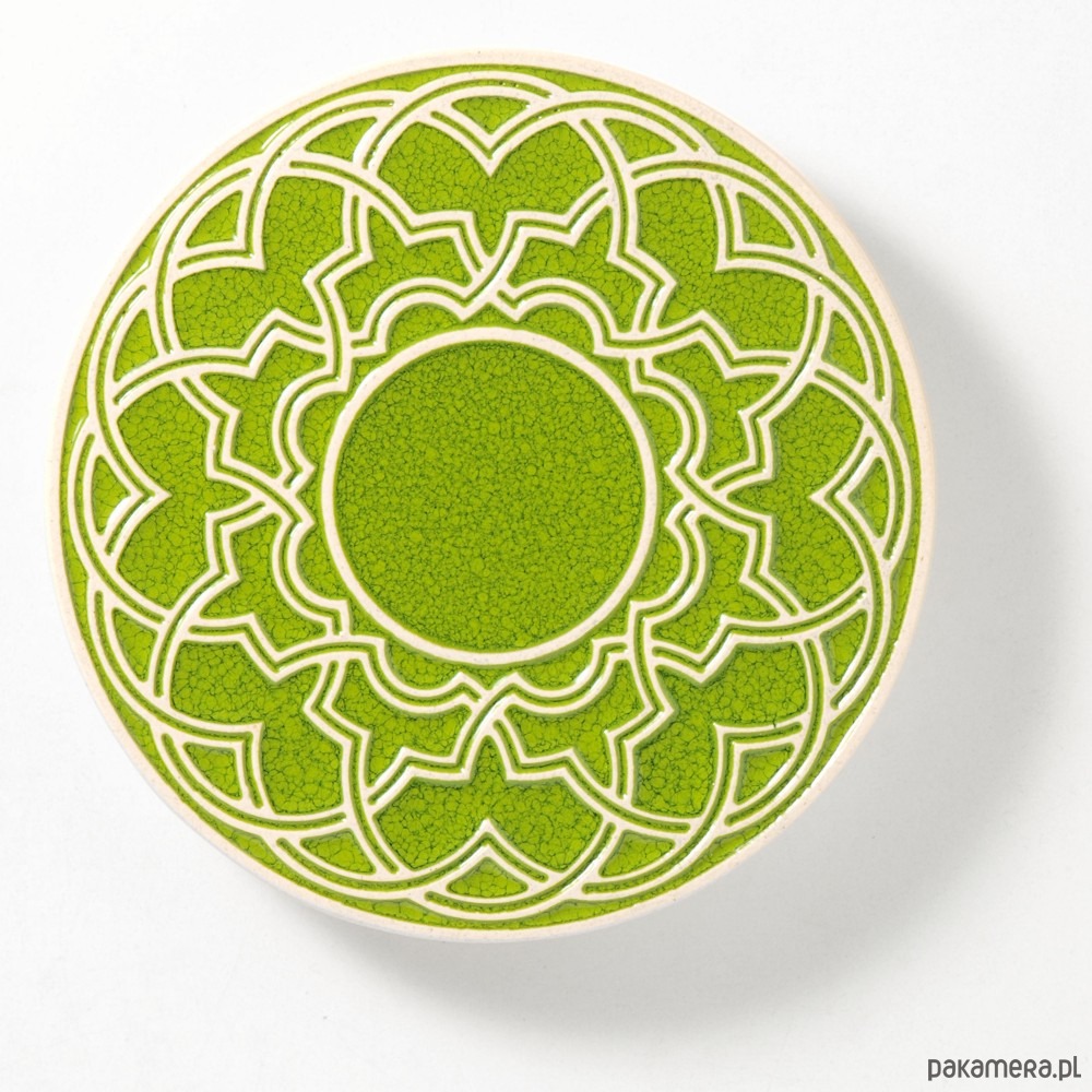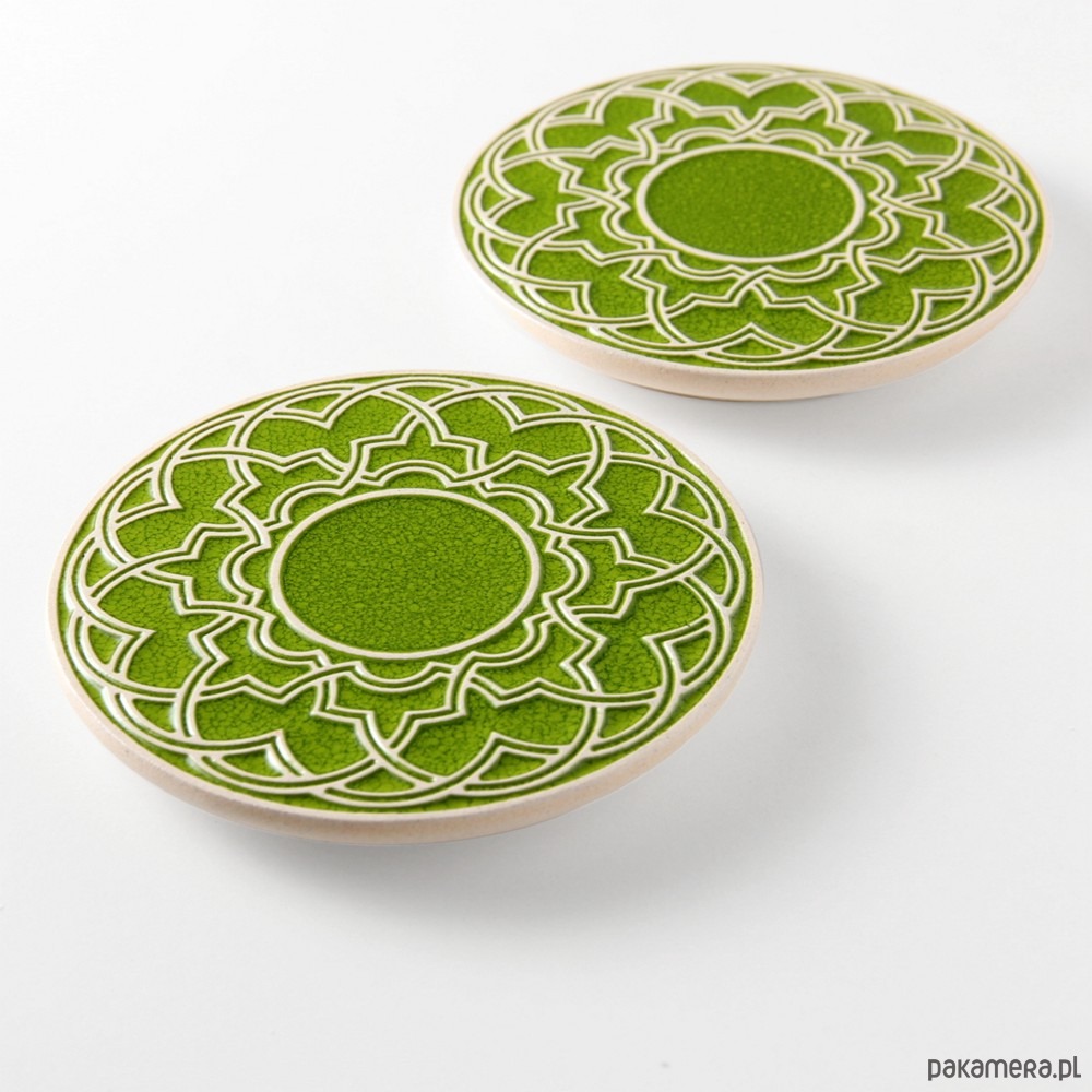 Ceramiczna podstawka z geometrycznym, lekko wypukłym ornamentem. Ręcznie wykonana z ciemnej gliny i ręcznie szkliwiona. Zastosowanie jako talerzyk pod kubek, filiżankę, świece, pod gorące naczynie itp.
