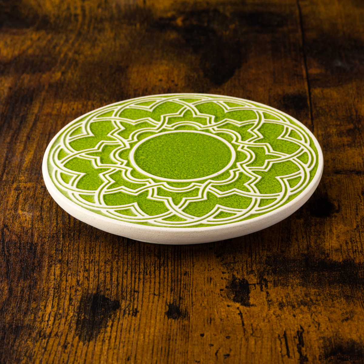 Ceramiczna okrągła podstawka z geometrycznym, lekko wypukłym ornamentem. Ręcznie wykonana z ciemnej gliny i ręcznie szkliwiona. Zastosowanie jako talerzyk pod kubek, filiżankę, świece, pod gorące naczynie itp.