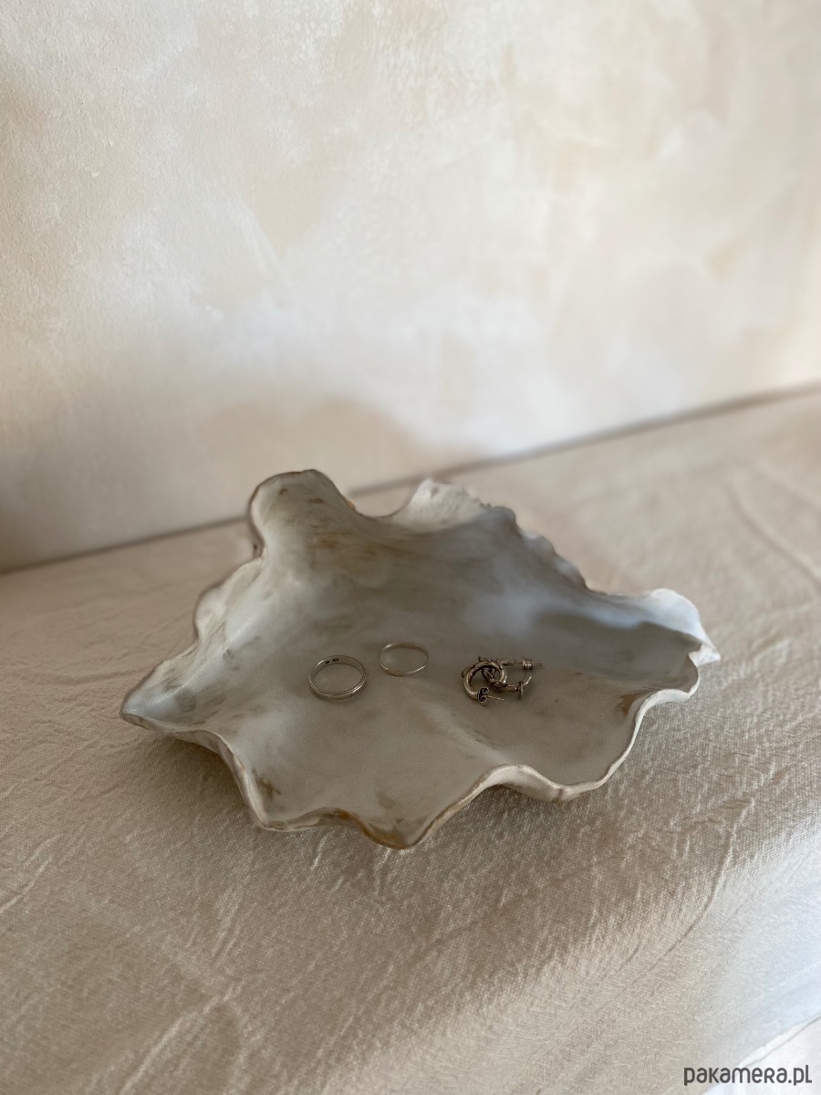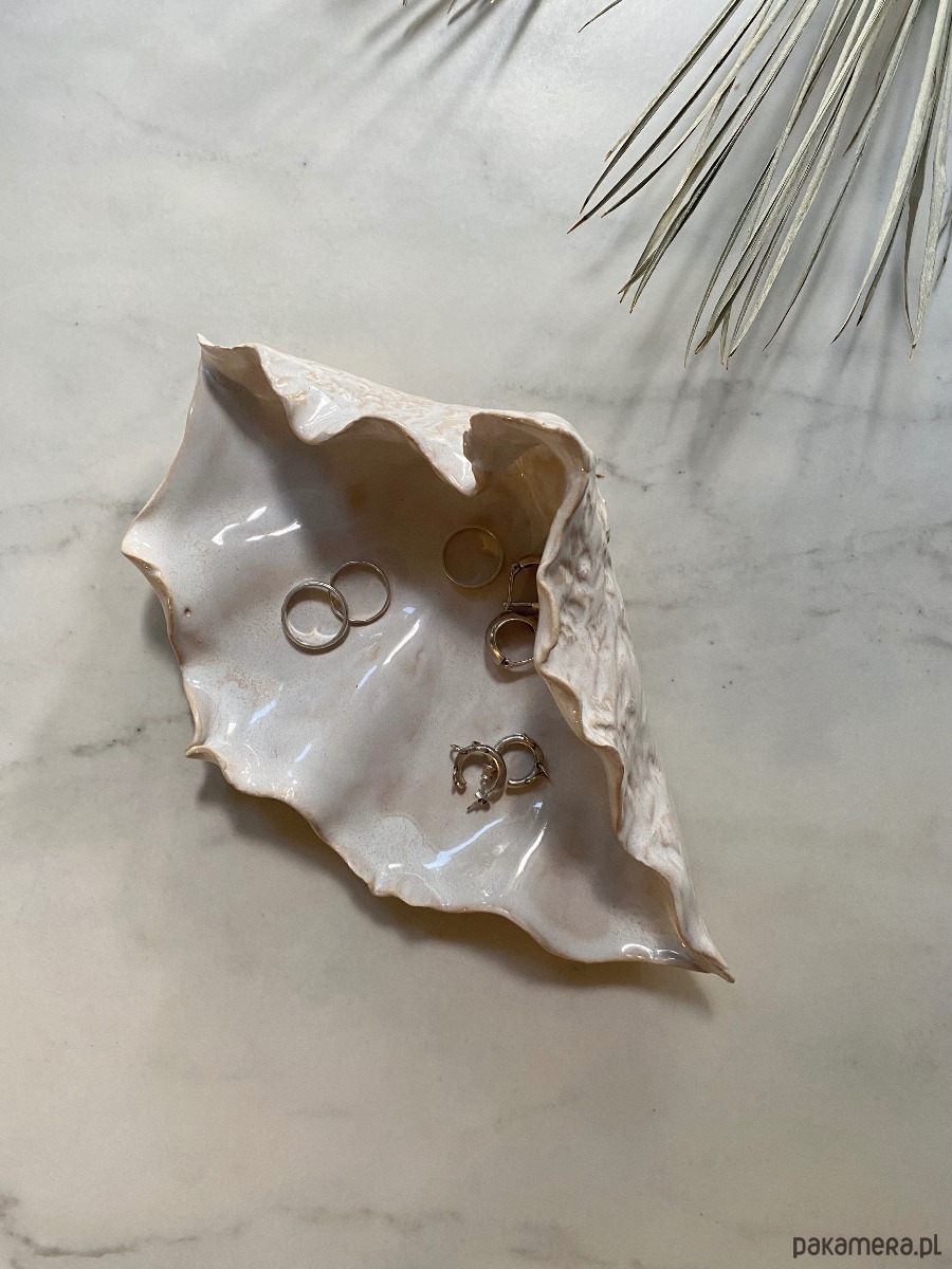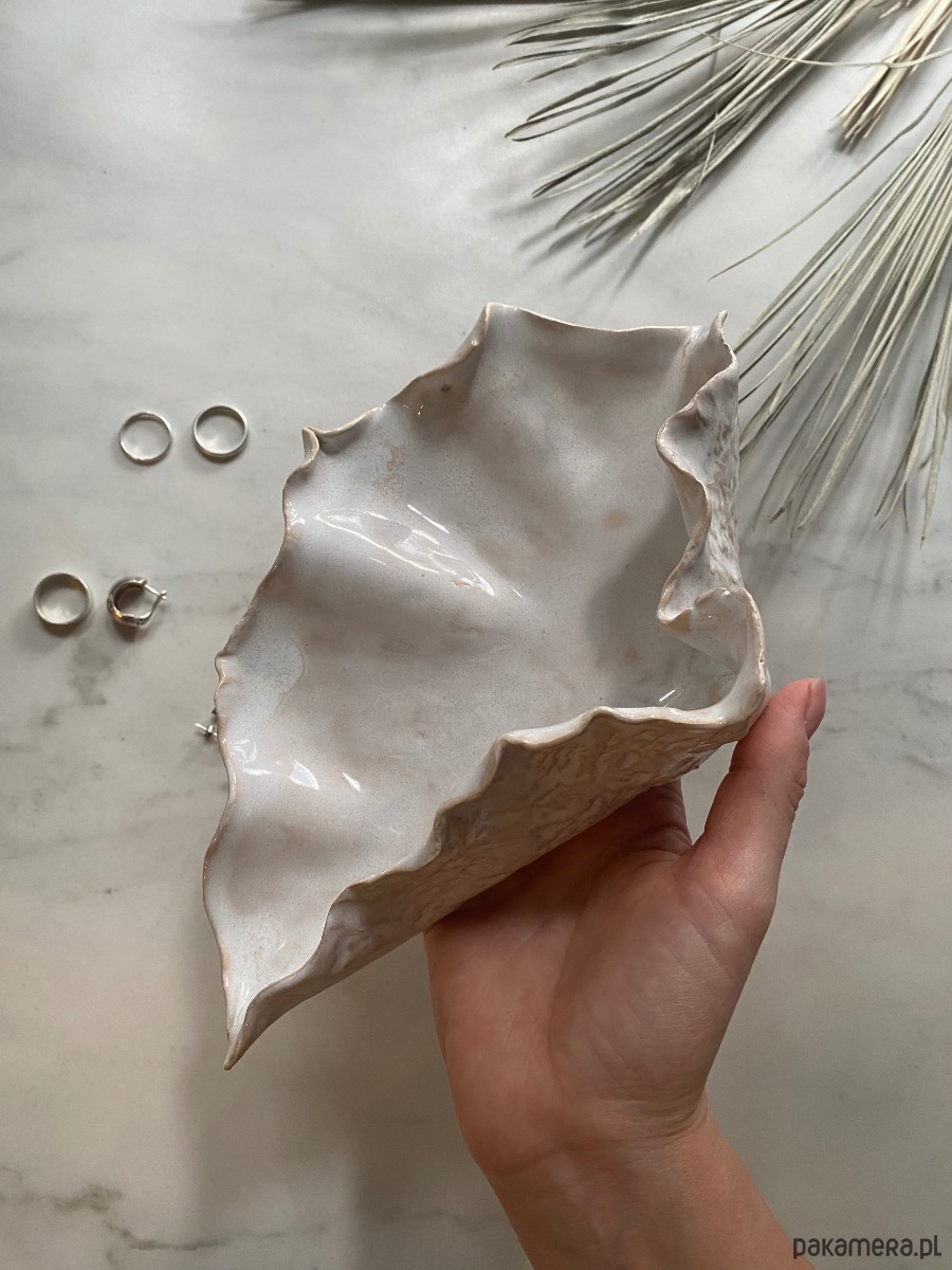 Ceramiczny talerzyk w kształcie muszli, ręcznie ulepiony i szkliwiony przez założycielkę marki- Moni. Idealny na biżuterię lub po prostu ukochane drobiazgi. Każda muszla jest tworzona od podstaw za pomocą dłoni, w związku z czym nie ma dwóch takich samych przedmiotów, każdy jest absolutnie wyjątkowy, noszący ślady rzemieślniczej pracy.