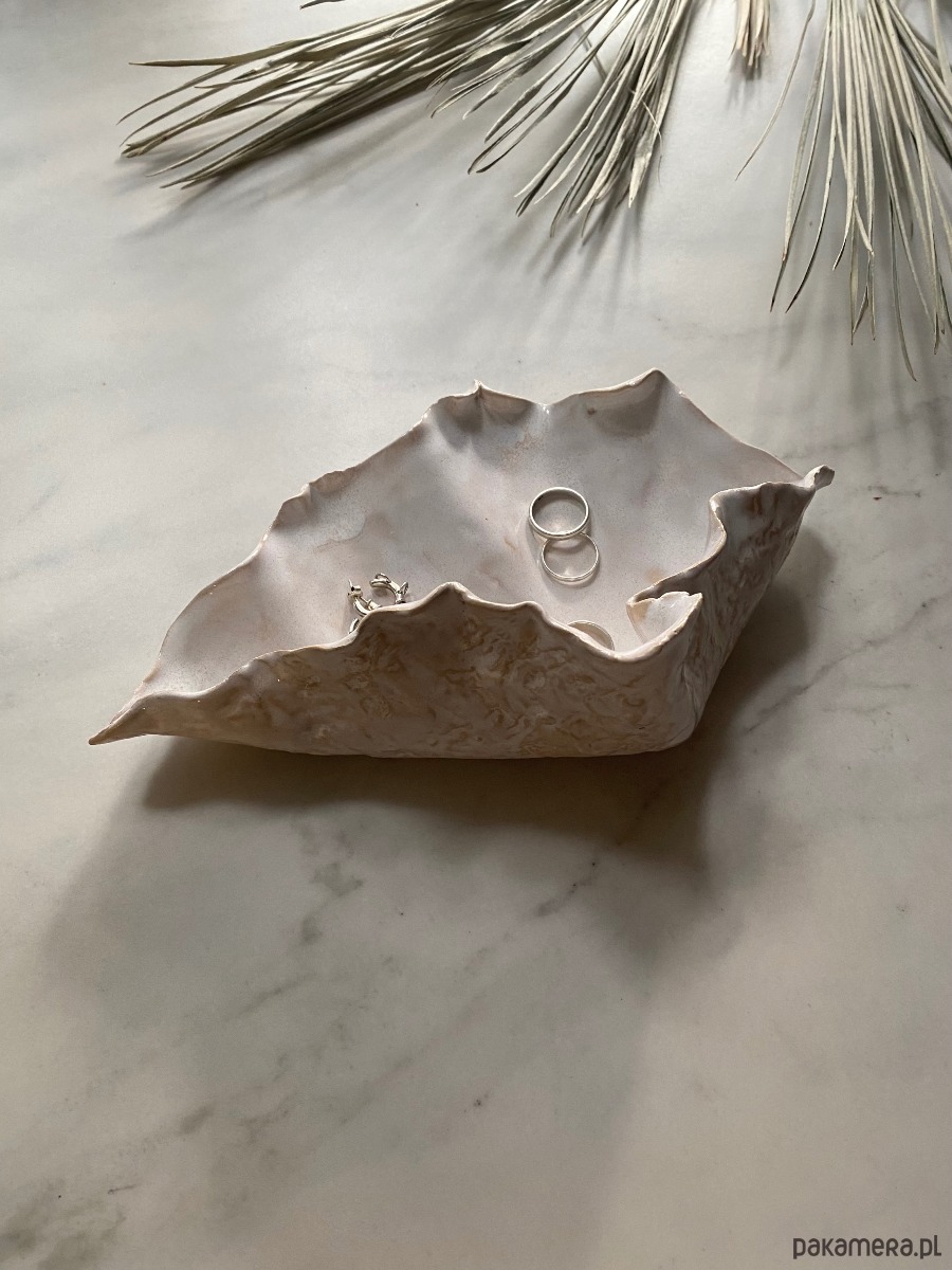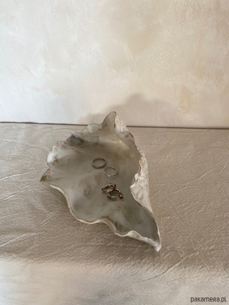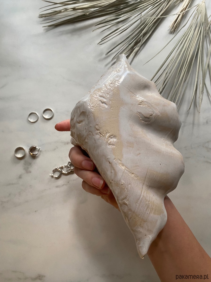 Ceramiczny talerzyk w kształcie muszli, ręcznie ulepiony i szkliwiony przez założycielkę marki- Moni. Idealny na biżuterię lub po prostu ukochane drobiazgi. Każda muszla jest tworzona od podstaw za pomocą dłoni, w związku z czym nie ma dwóch takich samych przedmiotów, każdy jest absolutnie wyjątkowy, noszący ślady rzemieślniczej pracy.