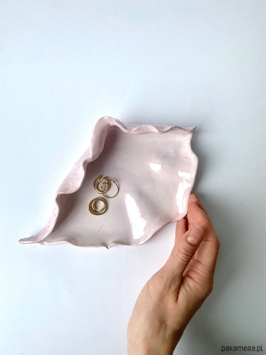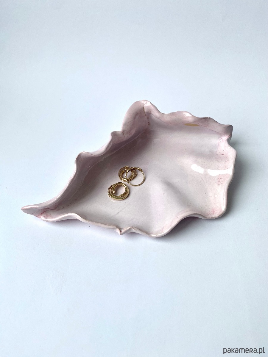 Gliniany talerzyk w kształcie muszelki. Idealny na biżuterię, palo santo lub po prostu ukochane drobiazgi. To kamionka, więc idealnie sprawdzi się również w łazience.