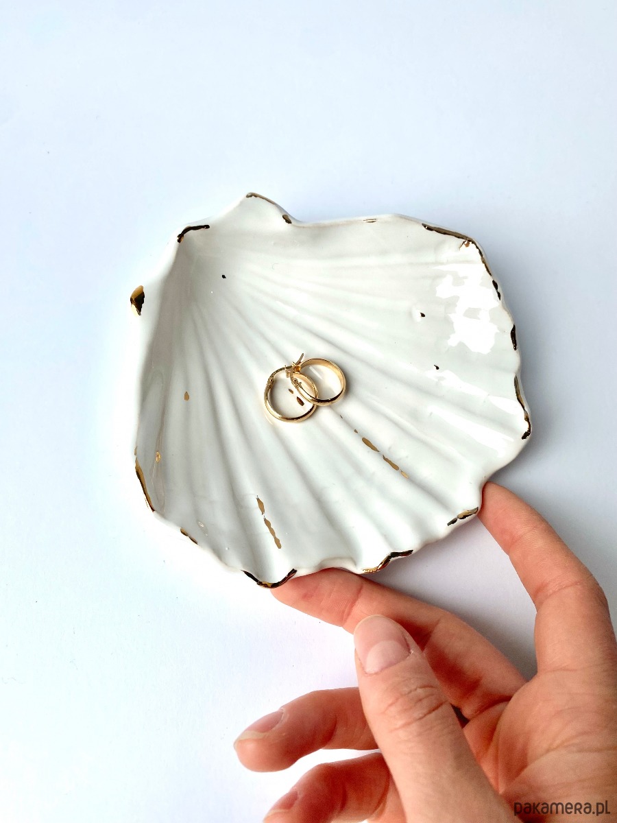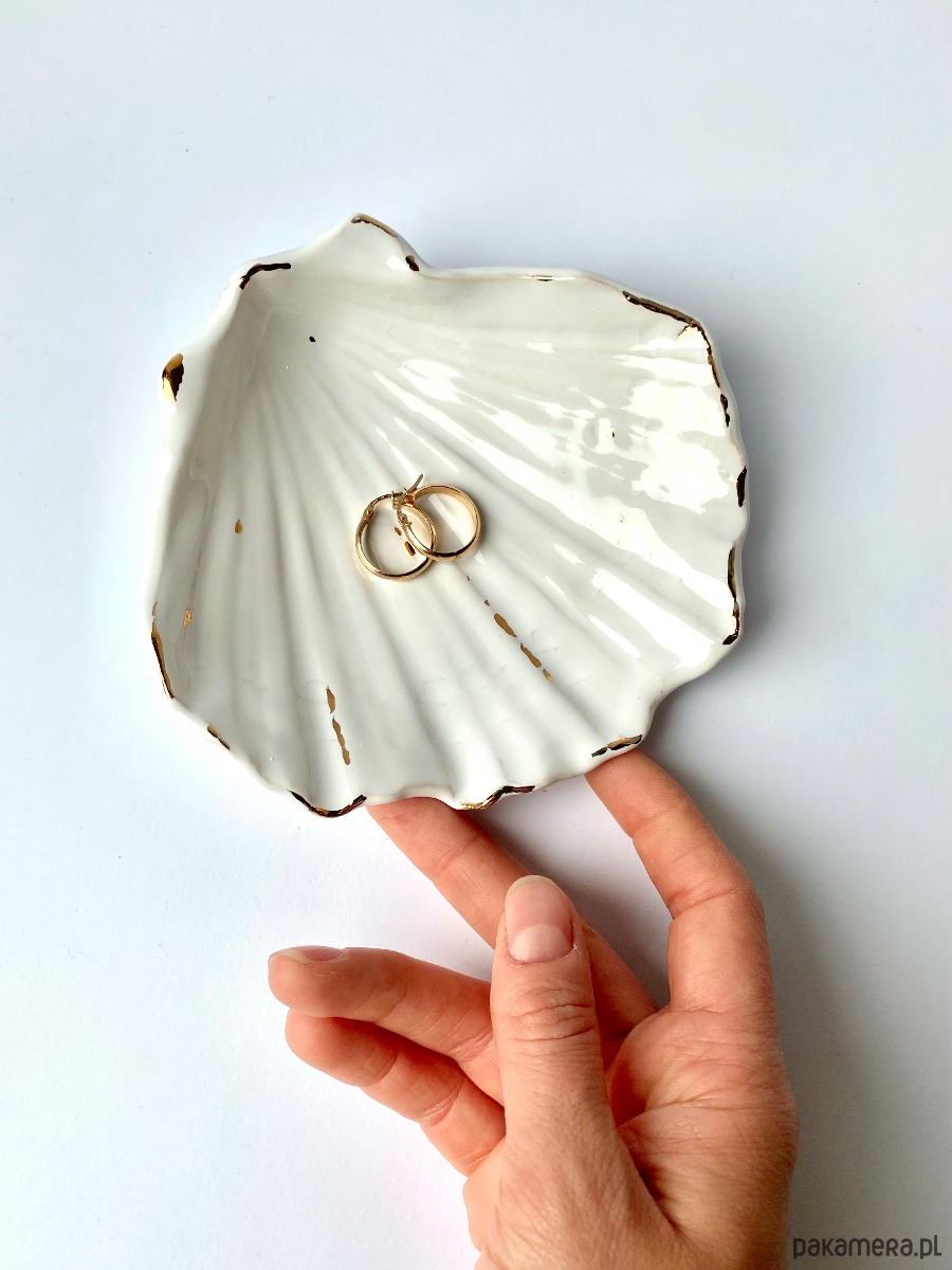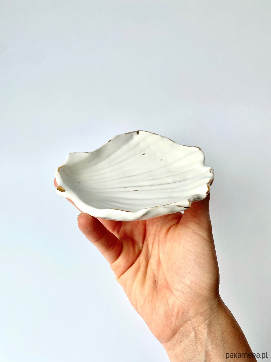Gliniany talerzyk w kształcie muszelki. Idealna na biżuterię lub po prostu ukochane drobiazgi. Muszla jest z kamionki, więc idealni sprawdzi się również w łazience jako mydelniczka na suchy szampon lub zwykle mydło.