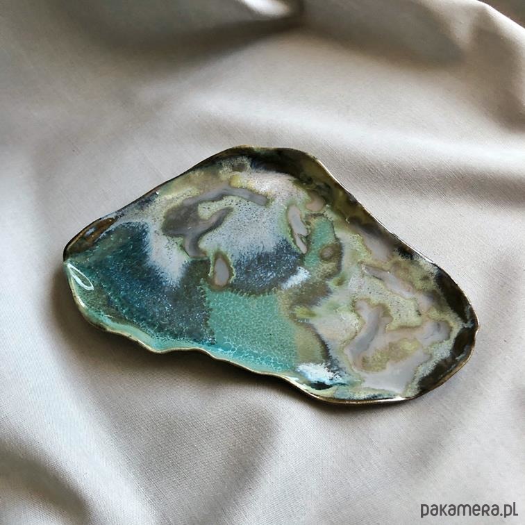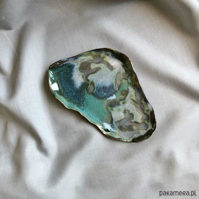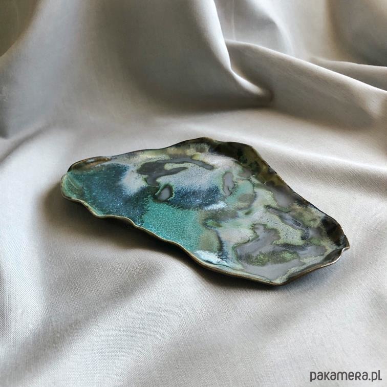 Unikatowa ceramiczna podstawka / talerzyk w łączących się odcieniach zieleni, granatu i szarości, tworzących niepowtarzalne kompozycje barwne.