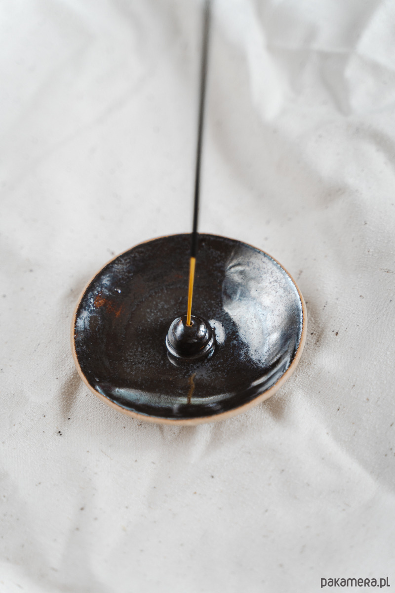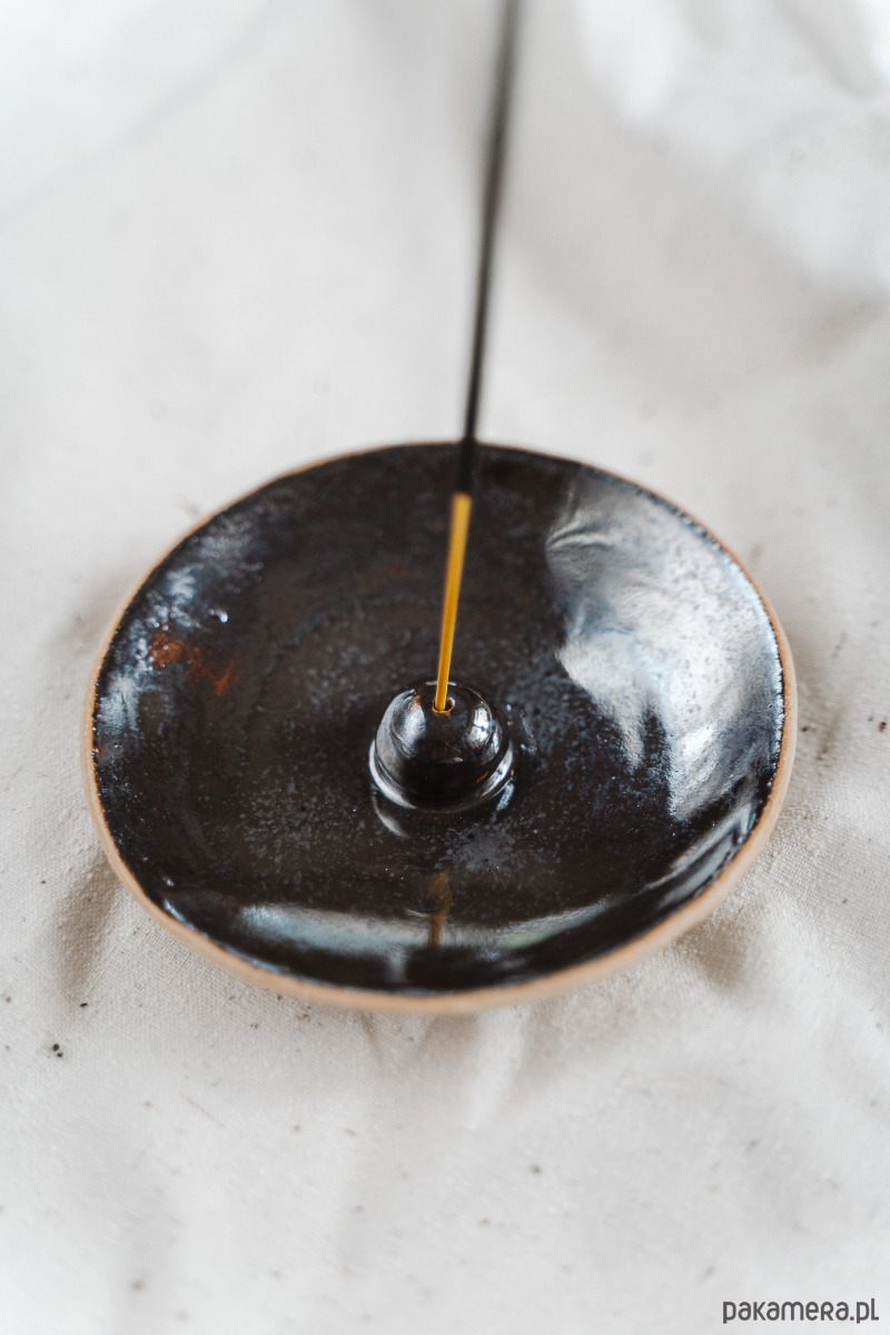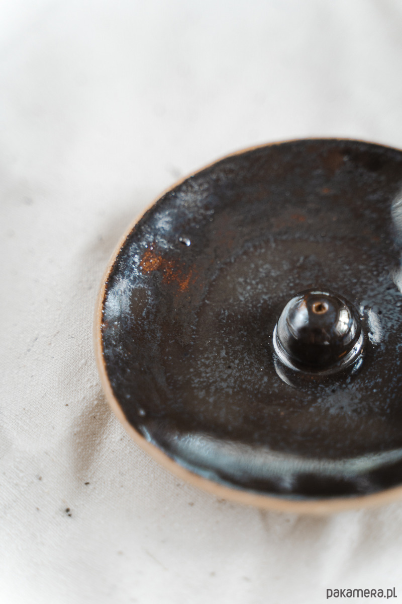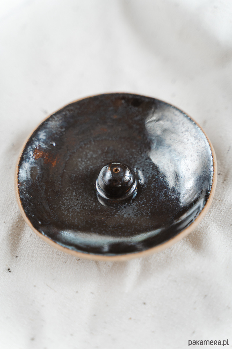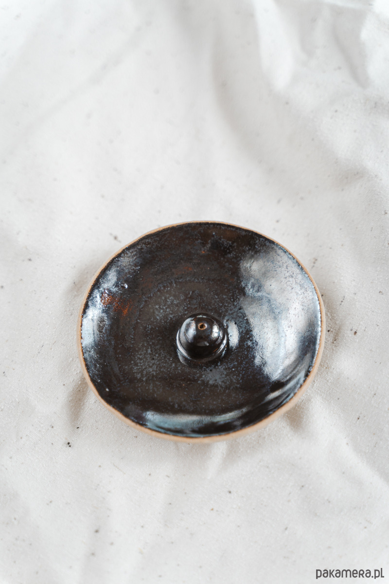 Ceramiczny talerzyk na kadzidełka wykonany z jasnej gliny, pokryty błyszczącym, lustrzanym szkliwem.