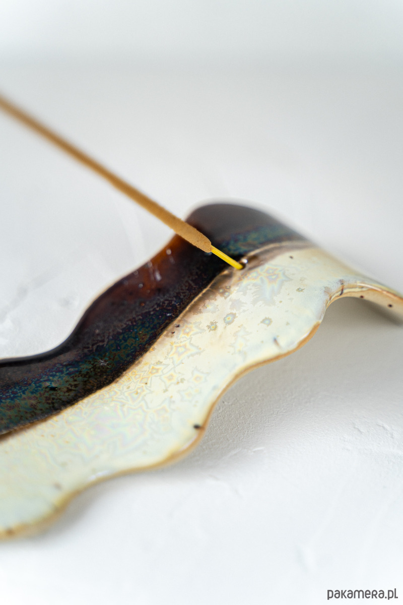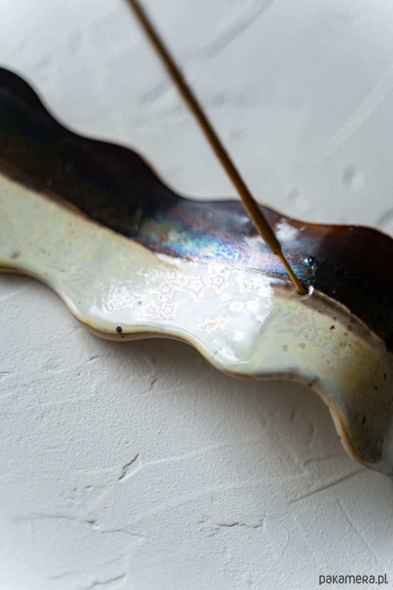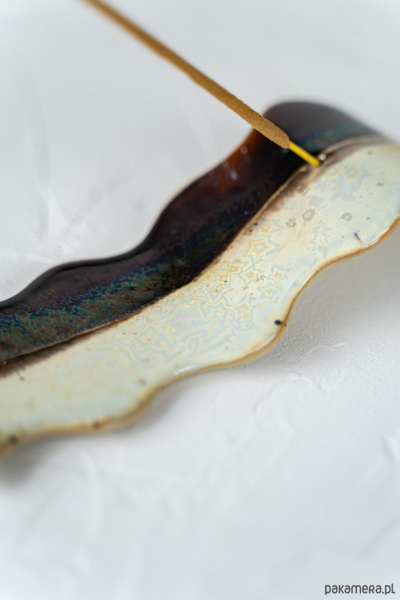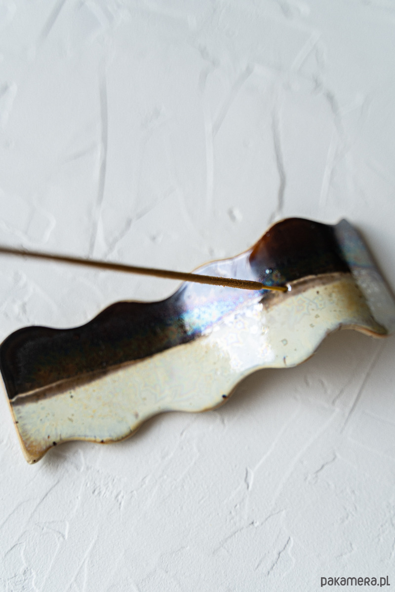 Ceramiczna kadzielnica wykonana ręcznie z białej gliny, pokryta błyszczącymi szkliwami.