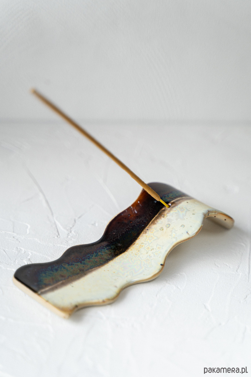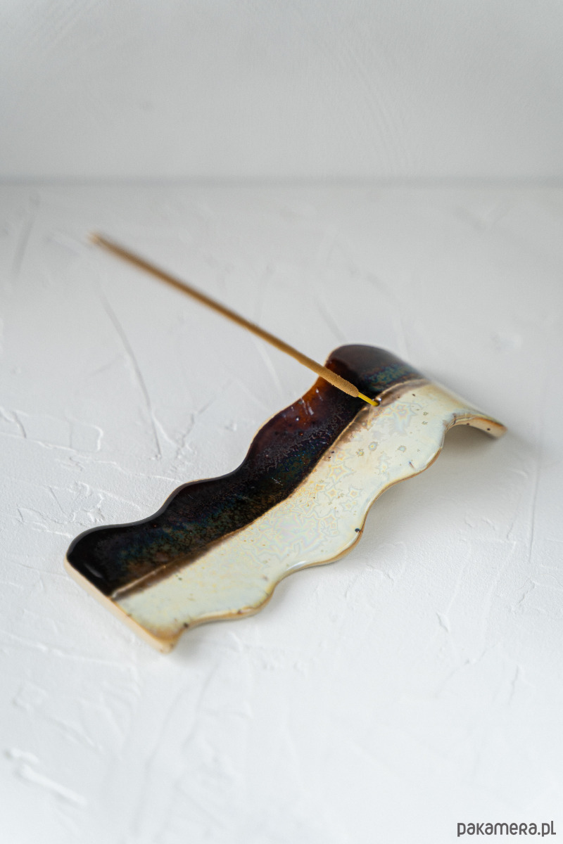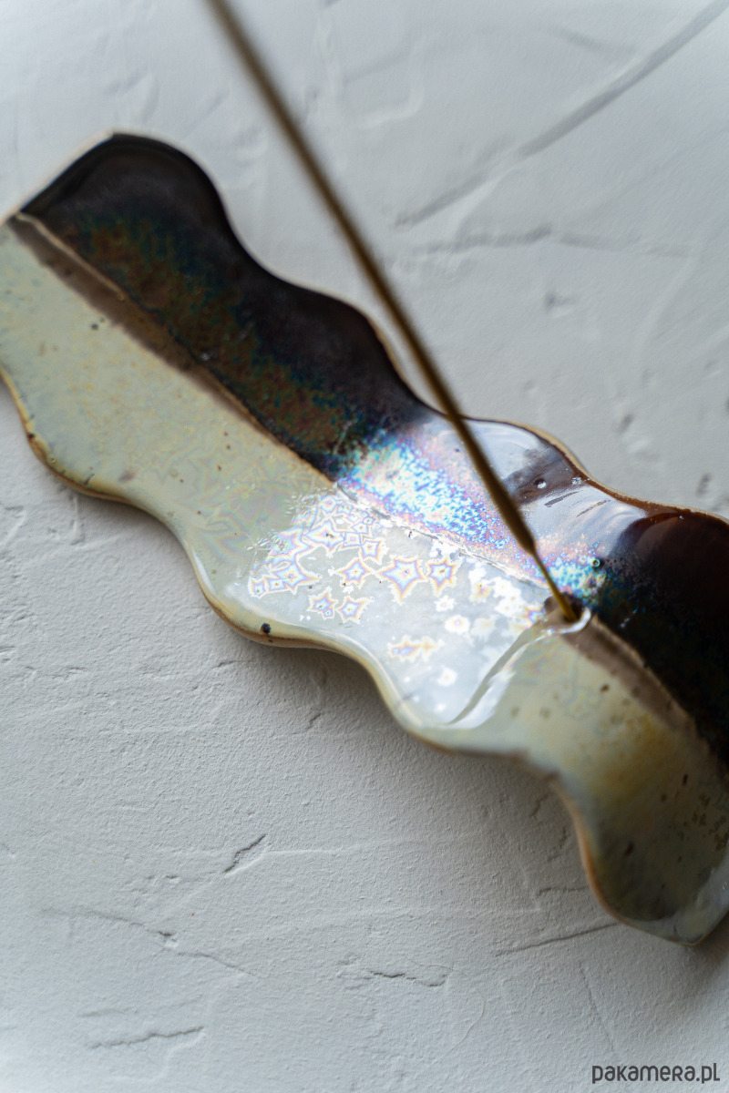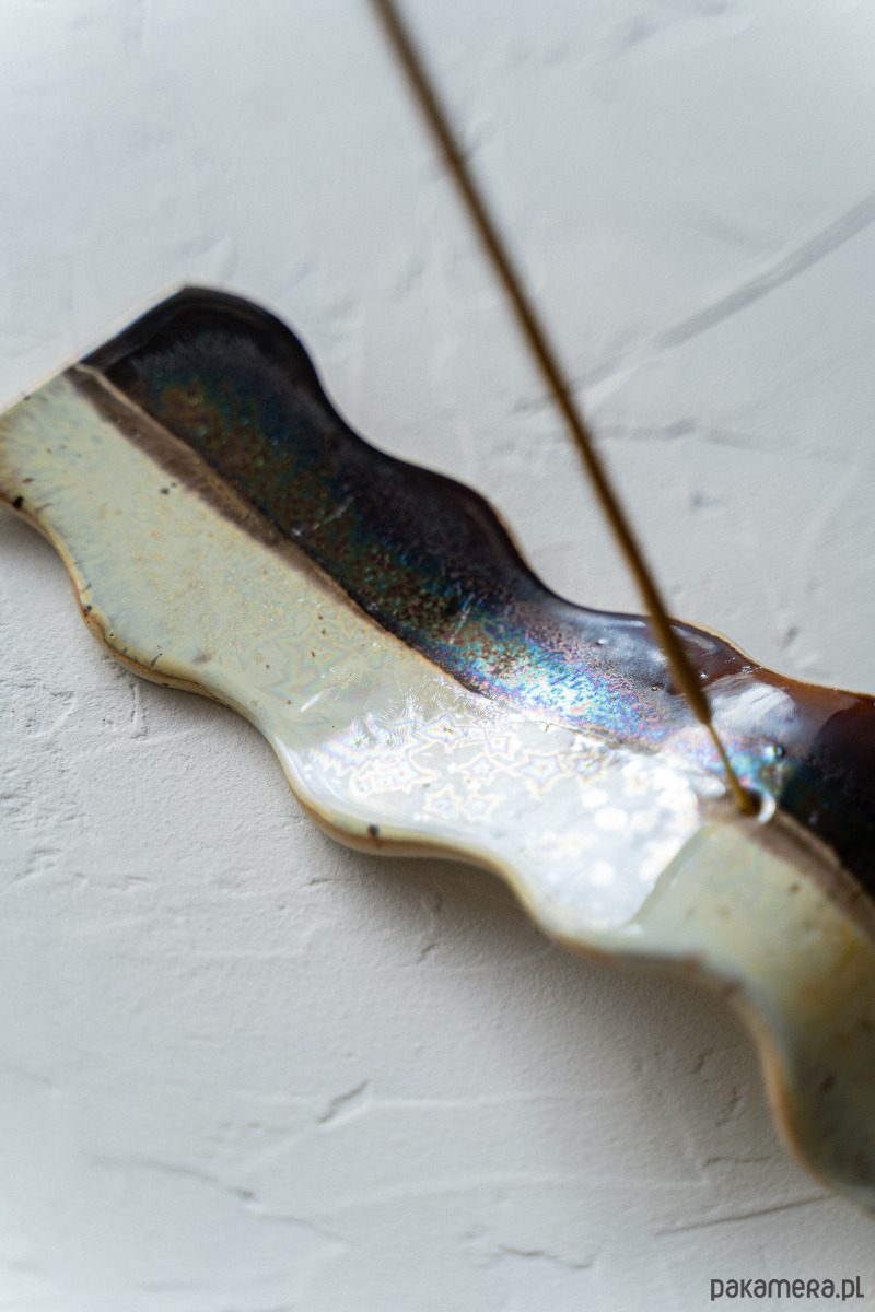 Ceramiczna kadzielnica wykonana ręcznie z białej gliny, pokryta błyszczącymi szkliwami.