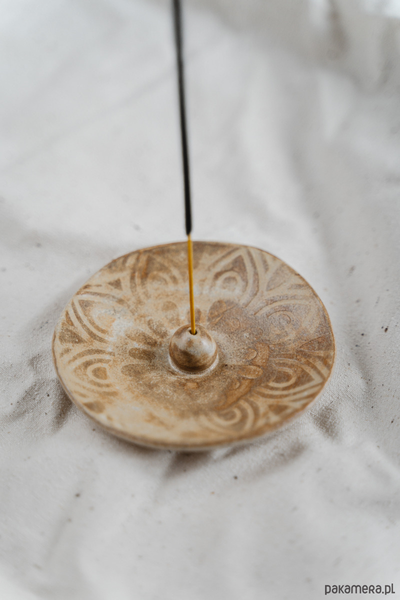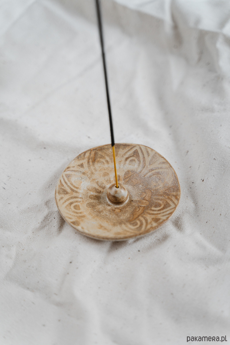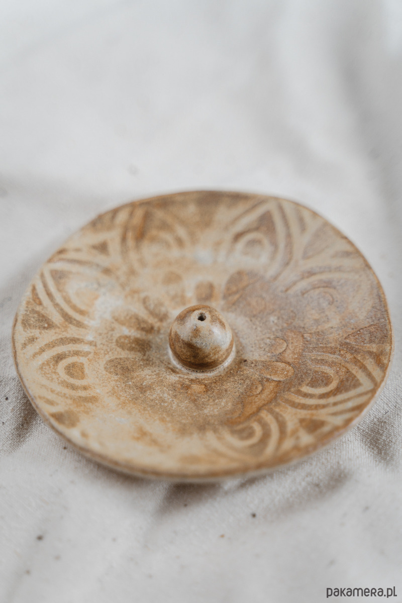 Ceramiczny talerzyk na kadzidełka wykonany z jasnej gliny, pokryty matowym szkliwem.