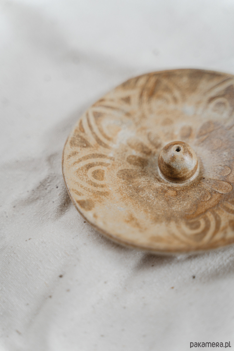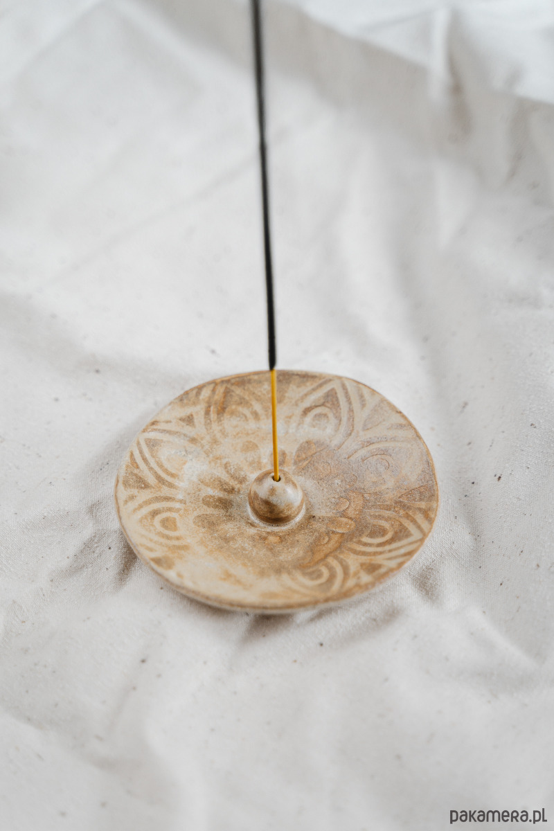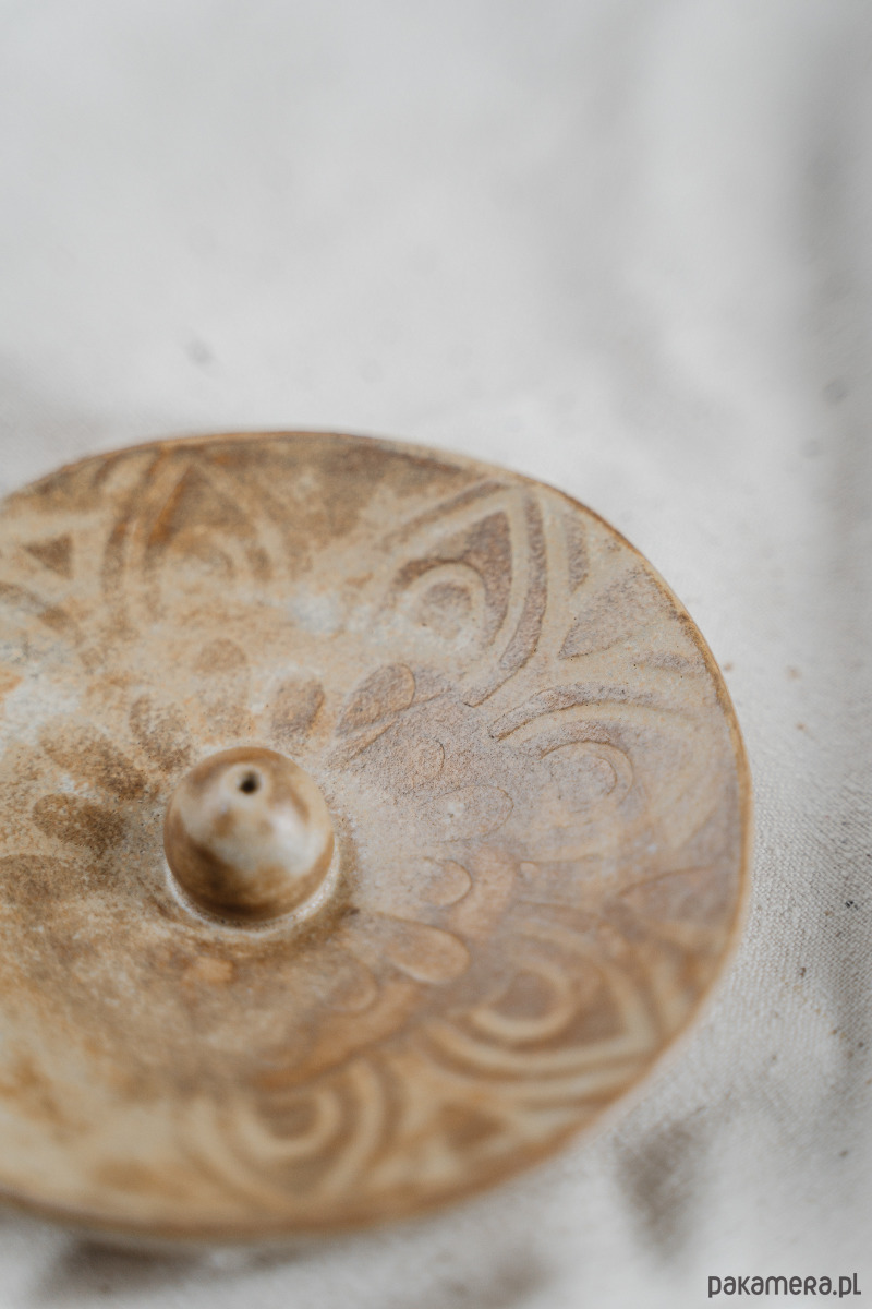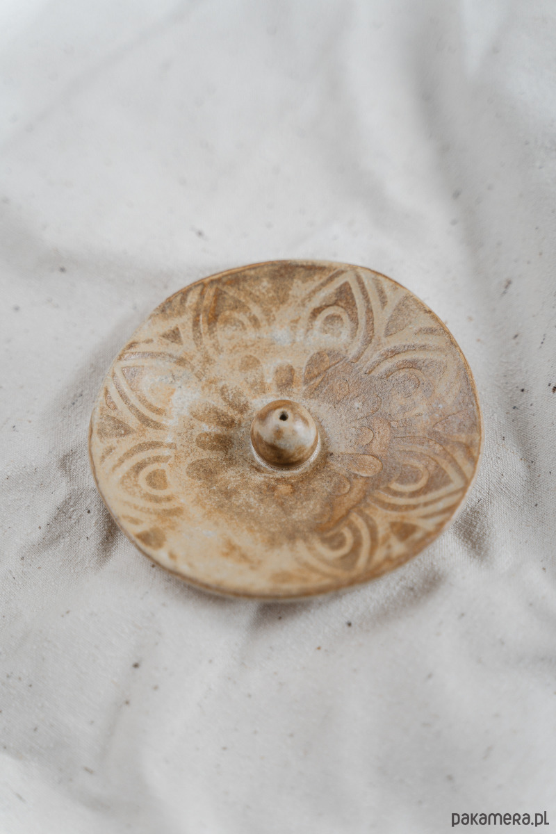 Ceramiczny talerzyk na kadzidełka wykonany z jasnej gliny, pokryty matowym szkliwem.
