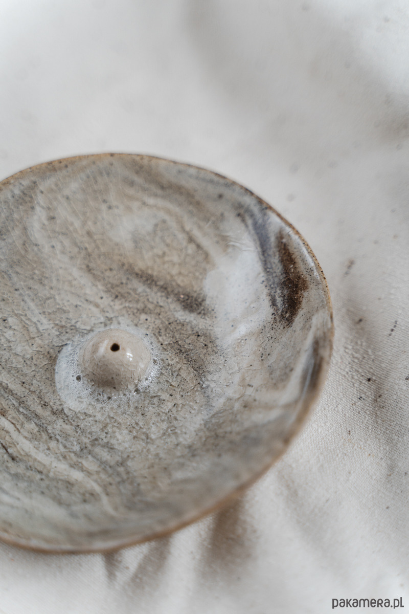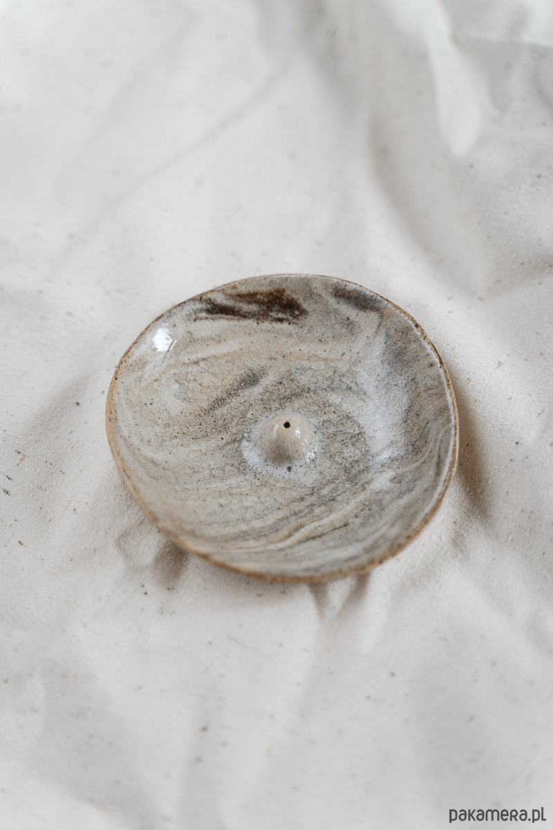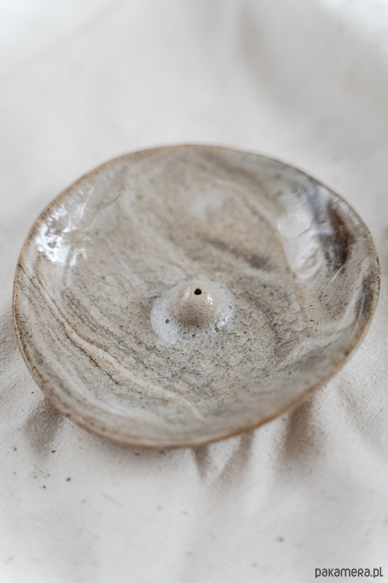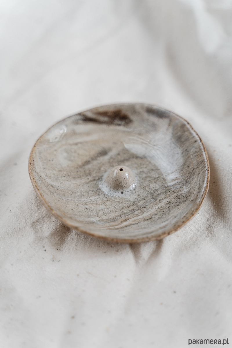 Ceramiczny talerzyk na kadzidełka wykonany z wielu kolorów gliny, pokryty błyszczącym szkliwem.