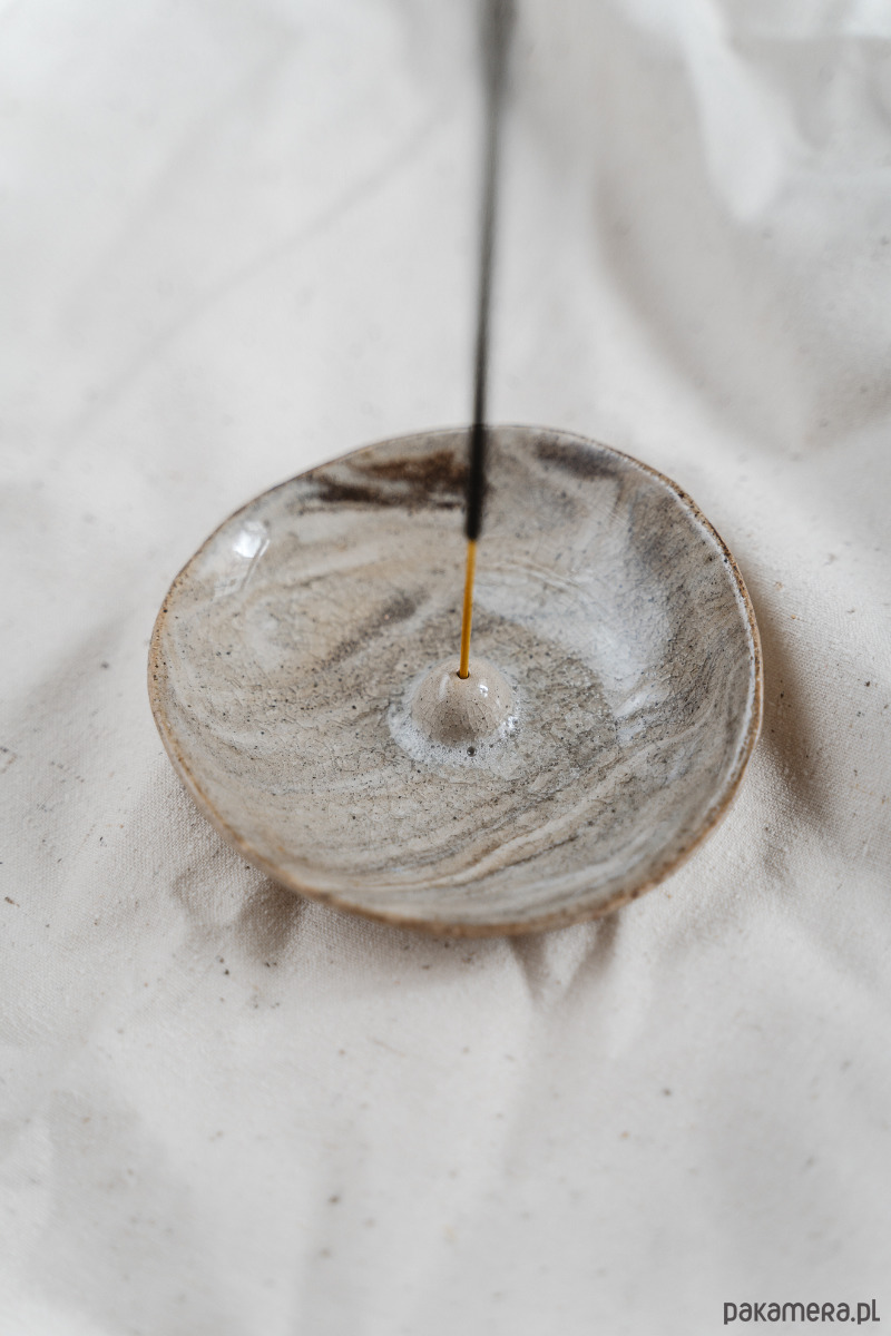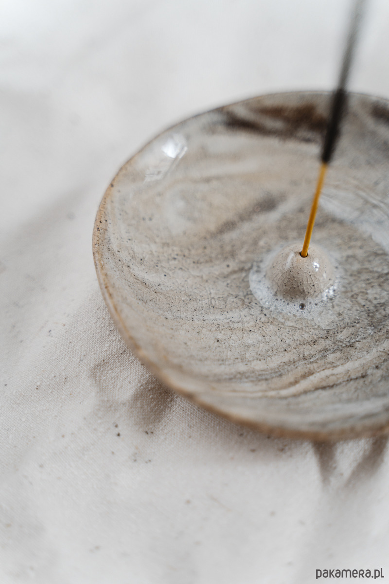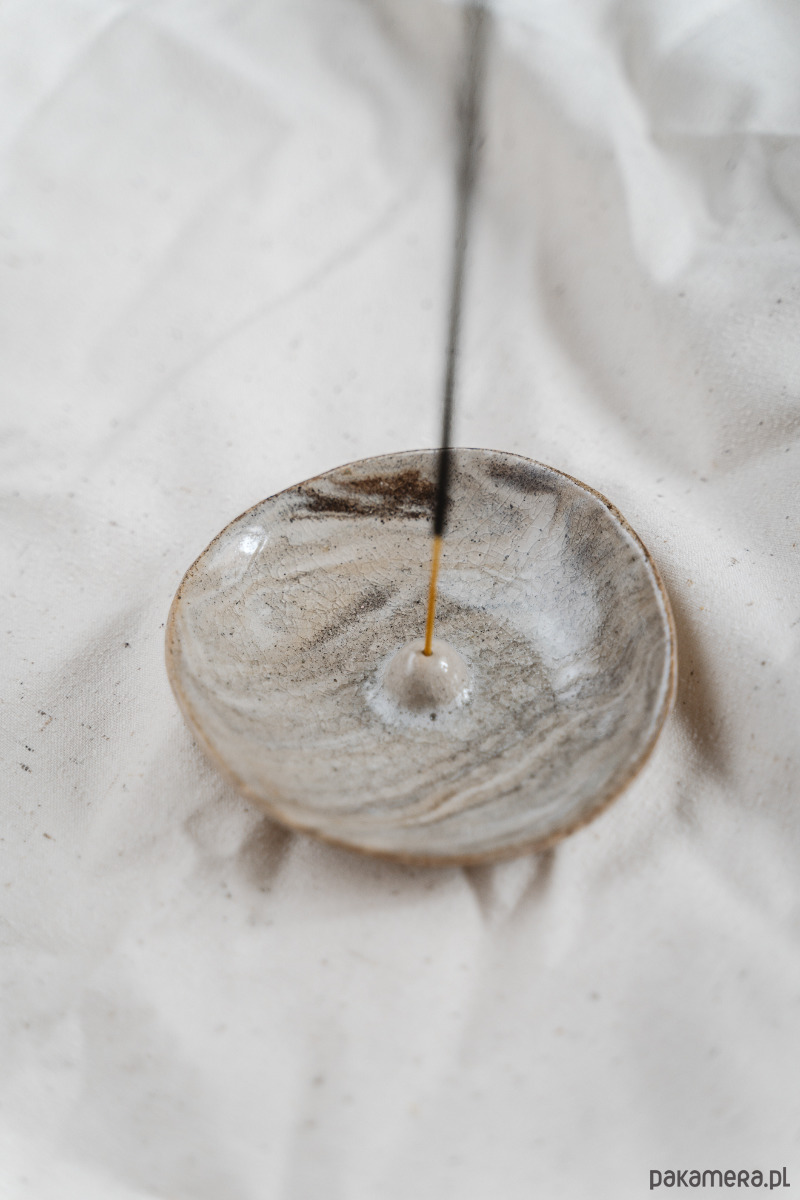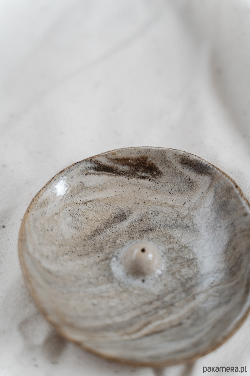 Ceramiczny talerzyk na kadzidełka wykonany z wielu kolorów gliny, pokryty błyszczącym szkliwem.