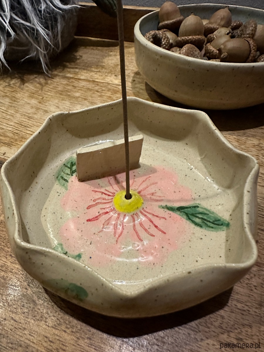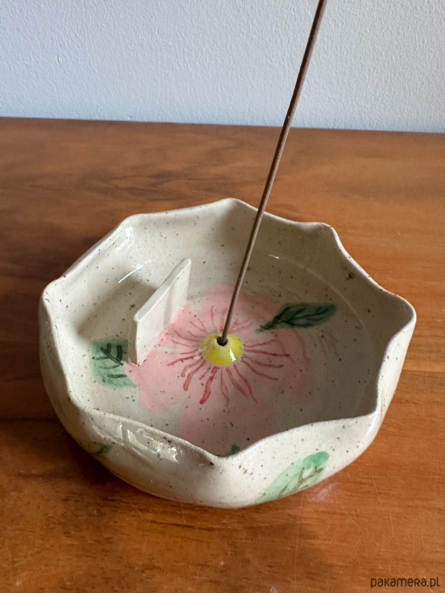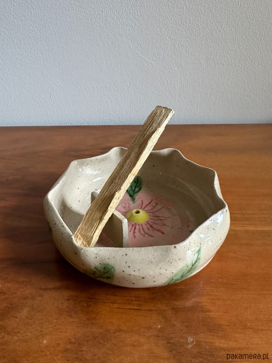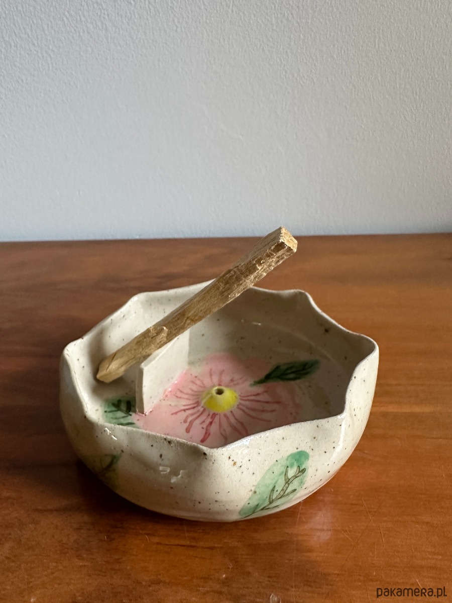 Ręcznie wykonana podstawka na kadzidełka i drewienko Palo Santo z gliny to wyjątkowy, naturalny dodatek, który wprowadzi do Twojego wnętrza spokojny, harmonijny nastrój. Pomalowana w delikatny, różowy kwiat w centrum i otoczona zielonymi listkami na bokach, zachwyca subtelnym wzornictwem inspirowanym naturą. Idealnie nadaje się do palenia ulubionych kadzidełek lub drewienka Palo Santo, dodając rytuałom zapachowym nutę elegancji i uroku. Ta ceramiczna podstawka nie tylko pięknie wygląda, ale również pełni praktyczną funkcję, wnosząc jednocześnie odrobinę magii do codziennych chwil relaksu.