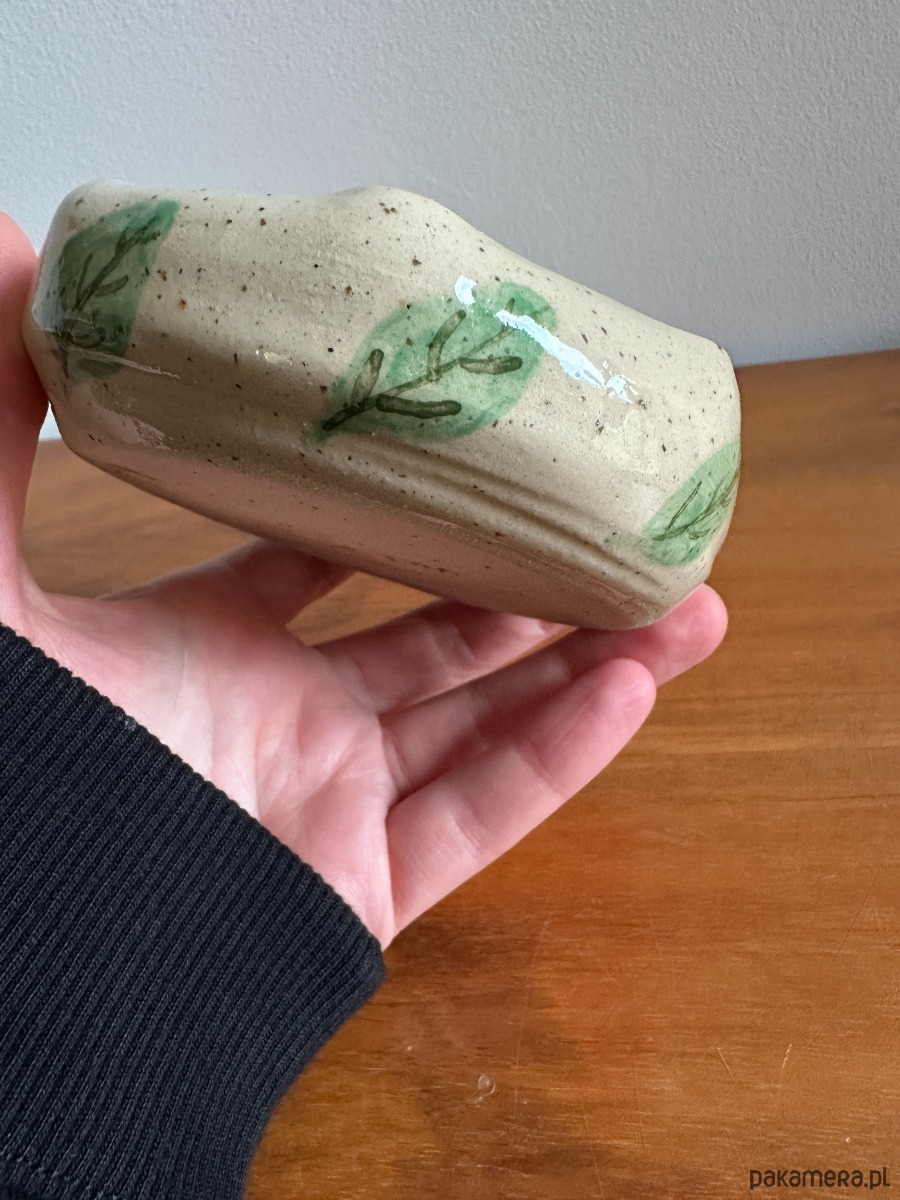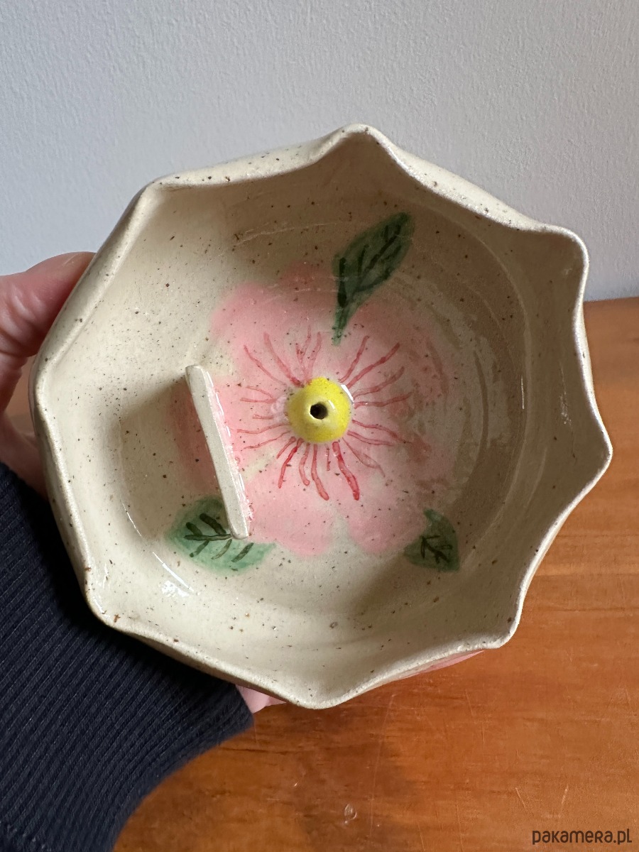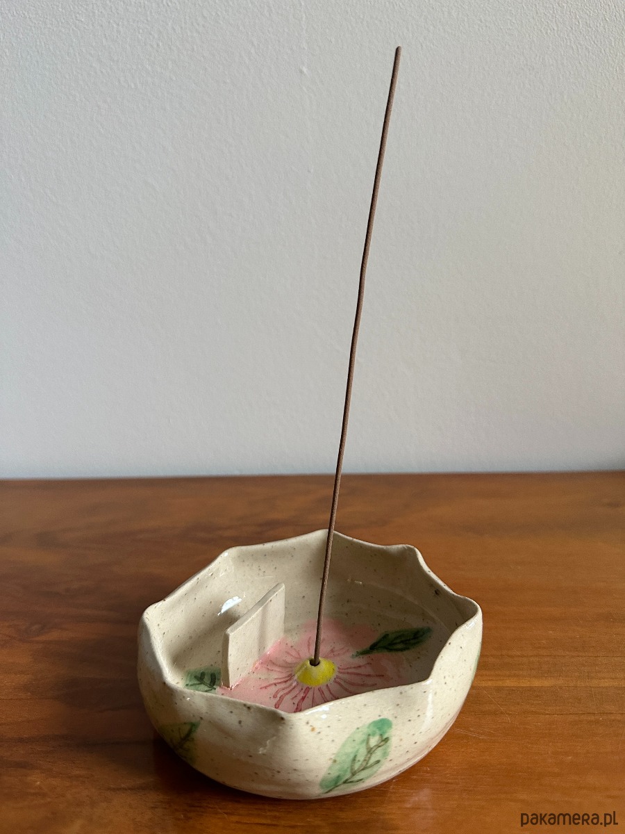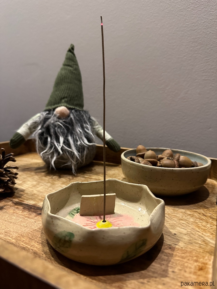 Ręcznie wykonana podstawka na kadzidełka i drewienko Palo Santo z gliny to wyjątkowy, naturalny dodatek, który wprowadzi do Twojego wnętrza spokojny, harmonijny nastrój. Pomalowana w delikatny, różowy kwiat w centrum i otoczona zielonymi listkami na bokach, zachwyca subtelnym wzornictwem inspirowanym naturą. Idealnie nadaje się do palenia ulubionych kadzidełek lub drewienka Palo Santo, dodając rytuałom zapachowym nutę elegancji i uroku. Ta ceramiczna podstawka nie tylko pięknie wygląda, ale również pełni praktyczną funkcję, wnosząc jednocześnie odrobinę magii do codziennych chwil relaksu.