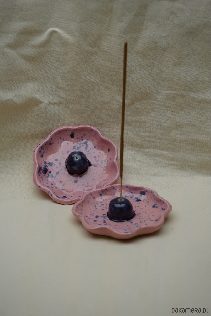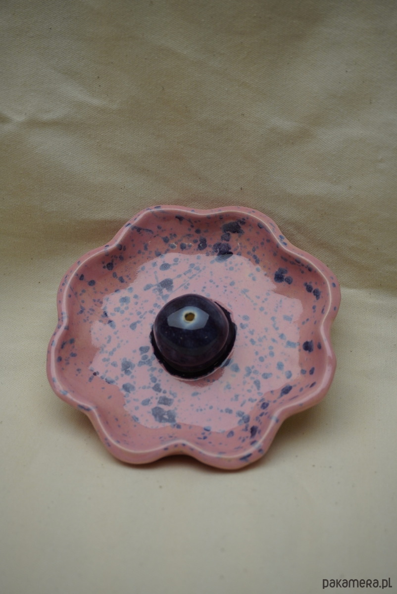 Ceramiczna podstawka w formie kwiatka na kadzidło wykonana ręcznie, szkliwiona i malowana ceramicznymi farbkami. W kulce znajduje się większa dziurka na kadzidełko (pomieści również te grubsze naturalne). Do wyboru kolory: niebieski nakrapiany z pomarańczową kulką, różowy nakrapiany z fioletową kulką, różowy nakrapiany z czerwoną kulką.