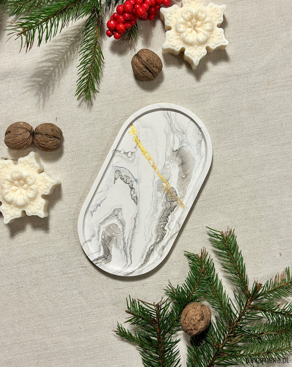 Każda dekoracja od początku do końca wykonana jest ręcznie, dzięki czemu jest unikatowa i nie ma dwóch takich samych sztuk. Dlatego też, rozmieszczenie wzoru czy odcień koloru mogą się nieznacznie różnić od tego prezentowanego na zdjęciu. Materiał, z którego je wykonuję to gips polimerowy. Małe bąbelki czy delikatne różnice w kolorze są naturalnymi cechami dla tego materiału.