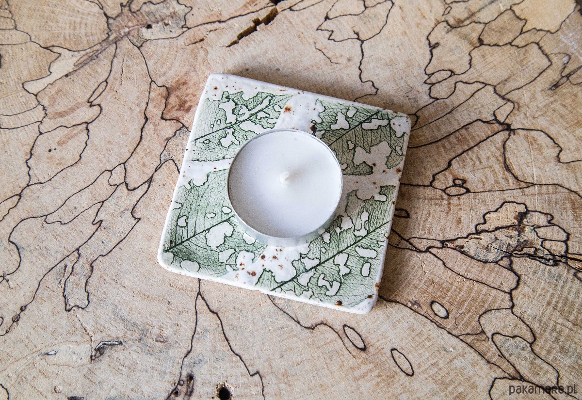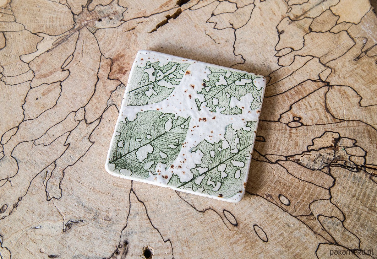 podstawka pod kubek lub świeczkę z odciskiem listków, precyzyjnie szkliwione