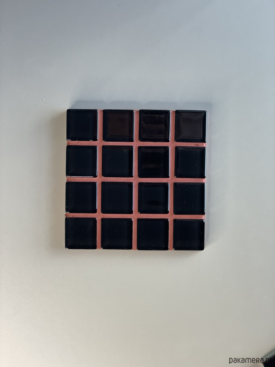 Geometryczna, minimalistyczna i pełna kontrastów. Podkładka została stworzona z ręcznie ułożonych czarnych kostek mozaiki, osadzonych w fugowej ramie o zielono-szarej barwie. Ten odważny duet kolorów przyciąga wzrok i sprawia, że nawet najprostszy kubek z herbatą prezentuje się wyjątkowo.