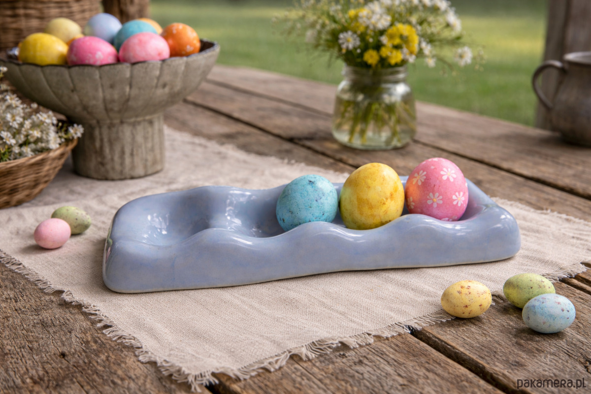 Elegancka podstawka na jajka w pastelowym odcieniu to idealny dodatek do wiosennych i wielkanocnych aranżacji stołu. Jej delikatna, falowana forma nie tylko pięknie eksponuje jajka, ale także dodaje całości subtelnego, dekoracyjnego charakteru.