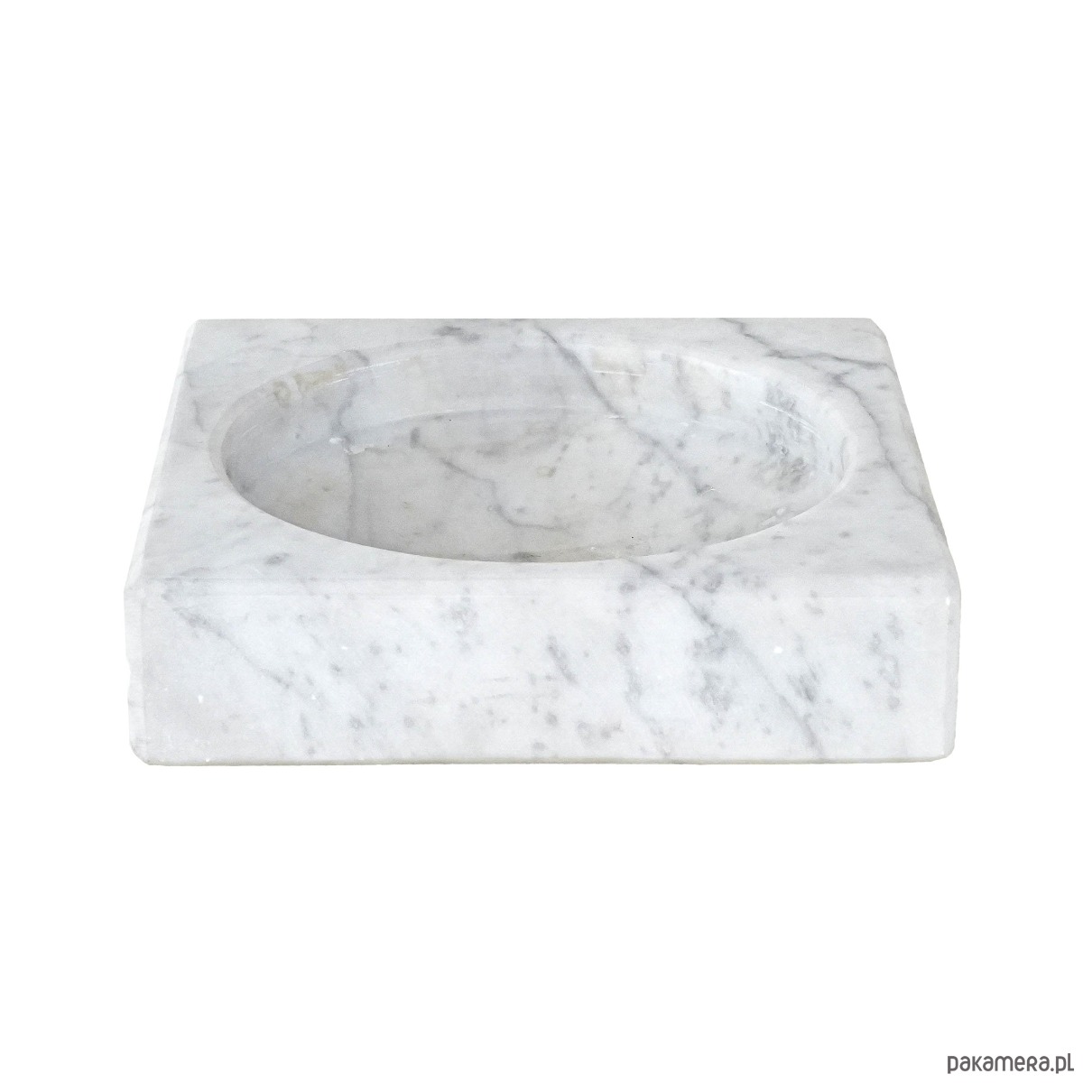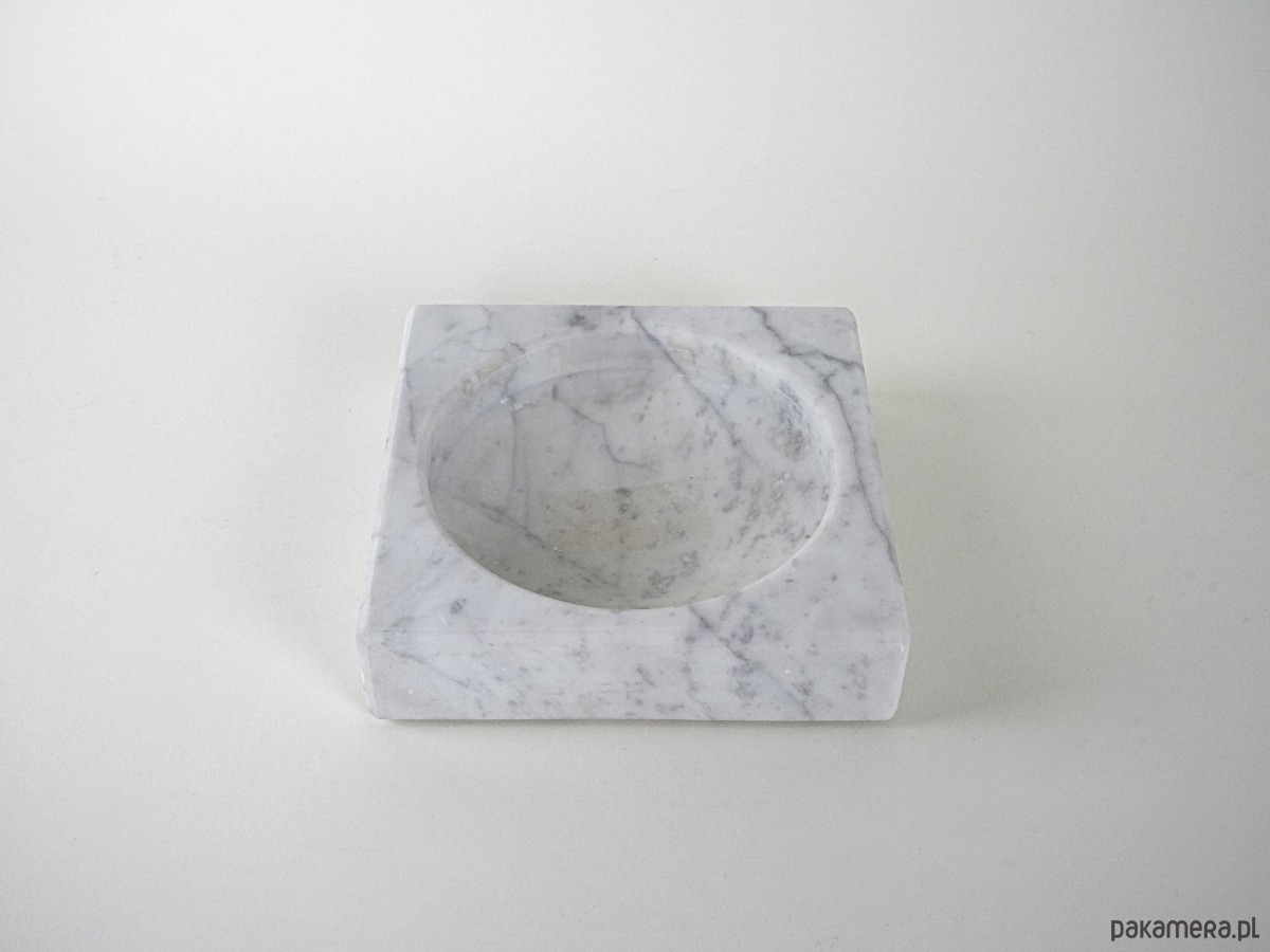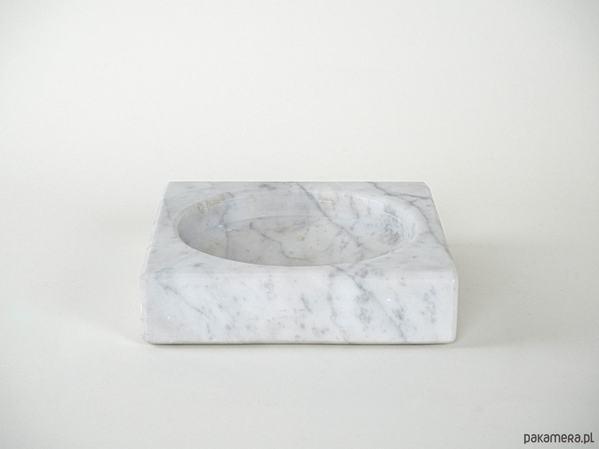 Kwadratowa misa z białego marmuru z naturalnym, szarym użyleniem. Minimalistyczna forma i ciężar naturalnego kamienia nadają jej elegancji i solidności. Prawdopodobnie produkcja z lat 70.–80., w duchu modernistycznym. Może służyć jako stylowy pojemnik na drobiazgi, klucze lub biżuterię, wprowadzając do wnętrza akcent luksusowego rzemiosła.