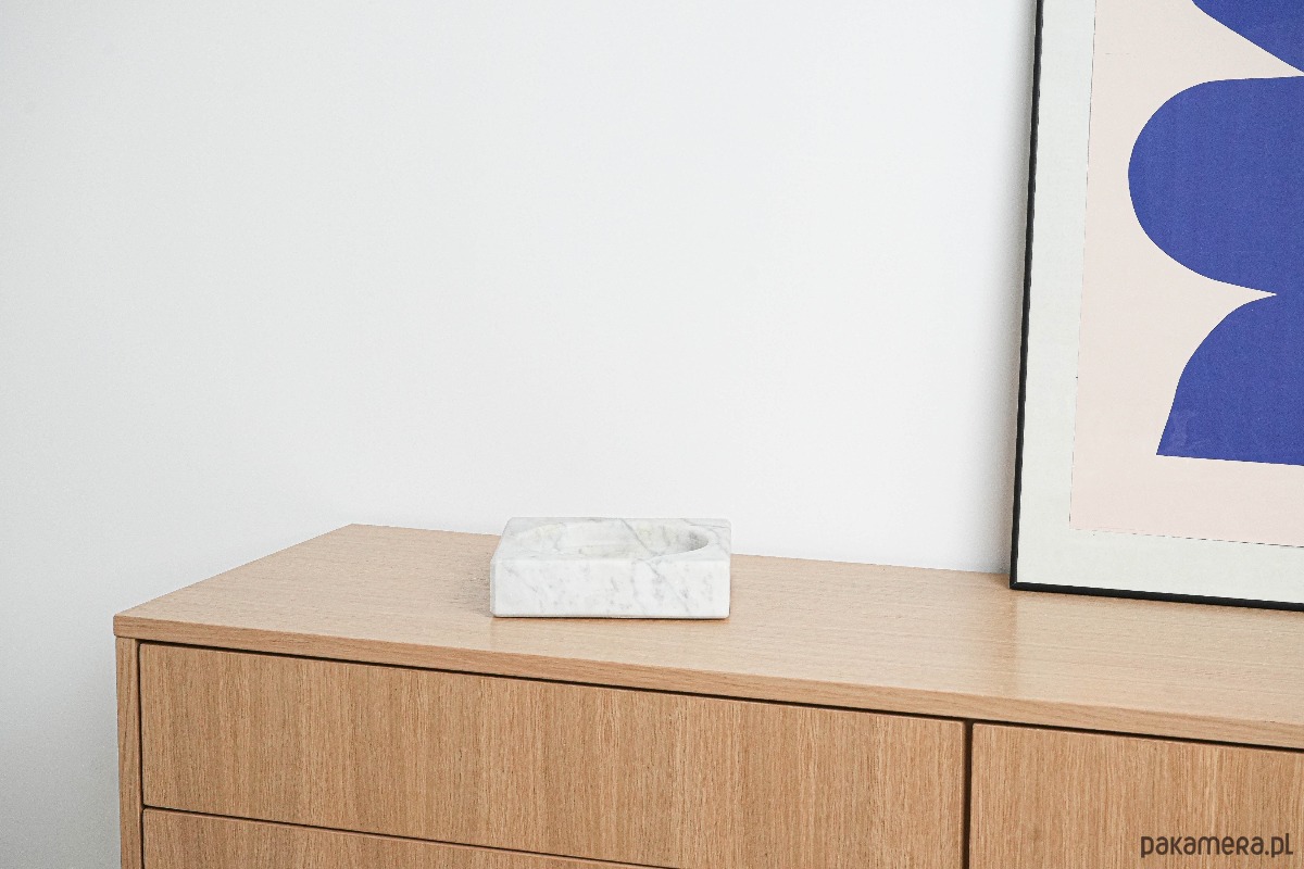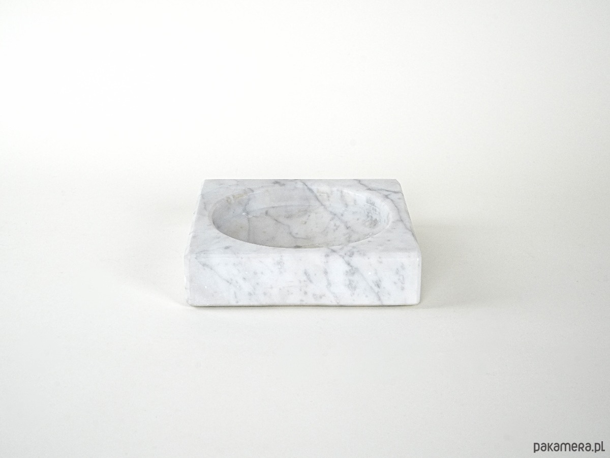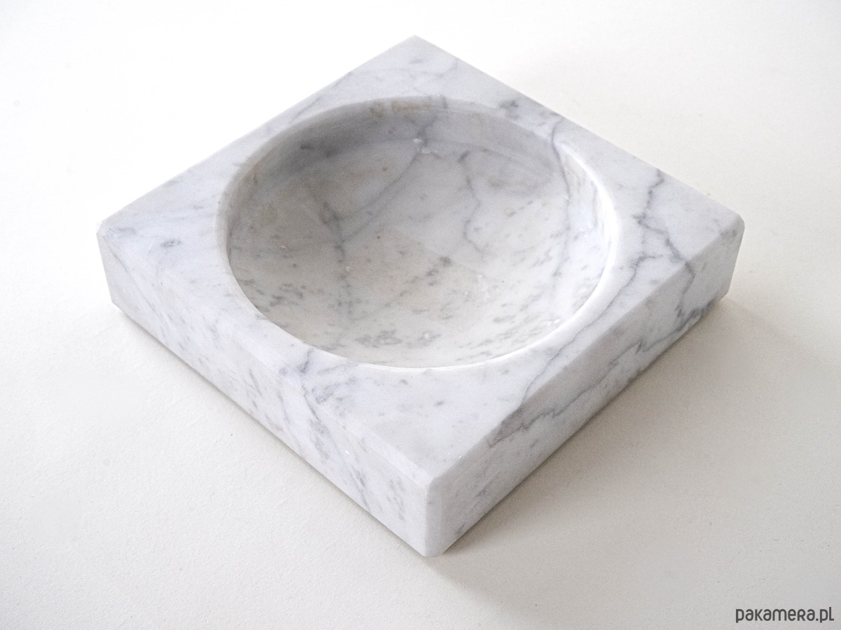 Kwadratowa misa z białego marmuru z naturalnym, szarym użyleniem. Minimalistyczna forma i ciężar naturalnego kamienia nadają jej elegancji i solidności. Prawdopodobnie produkcja z lat 70.–80., w duchu modernistycznym. Może służyć jako stylowy pojemnik na drobiazgi, klucze lub biżuterię, wprowadzając do wnętrza akcent luksusowego rzemiosła.