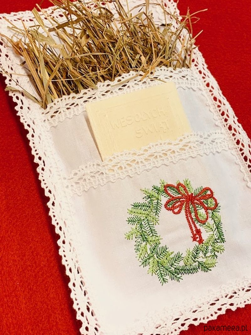 Unikalny haft: Precyzyjny, misternie wykonany haft wieńca świątecznego.