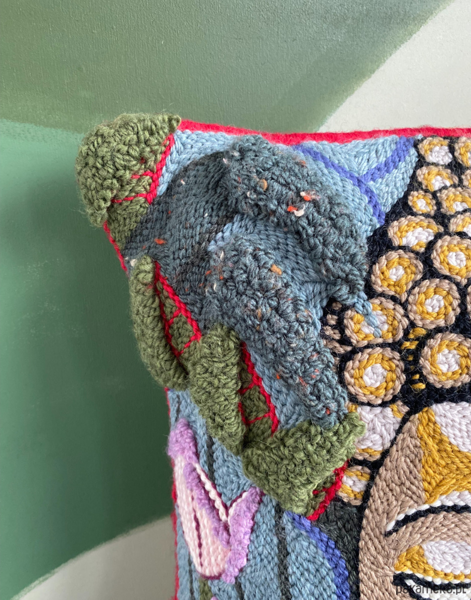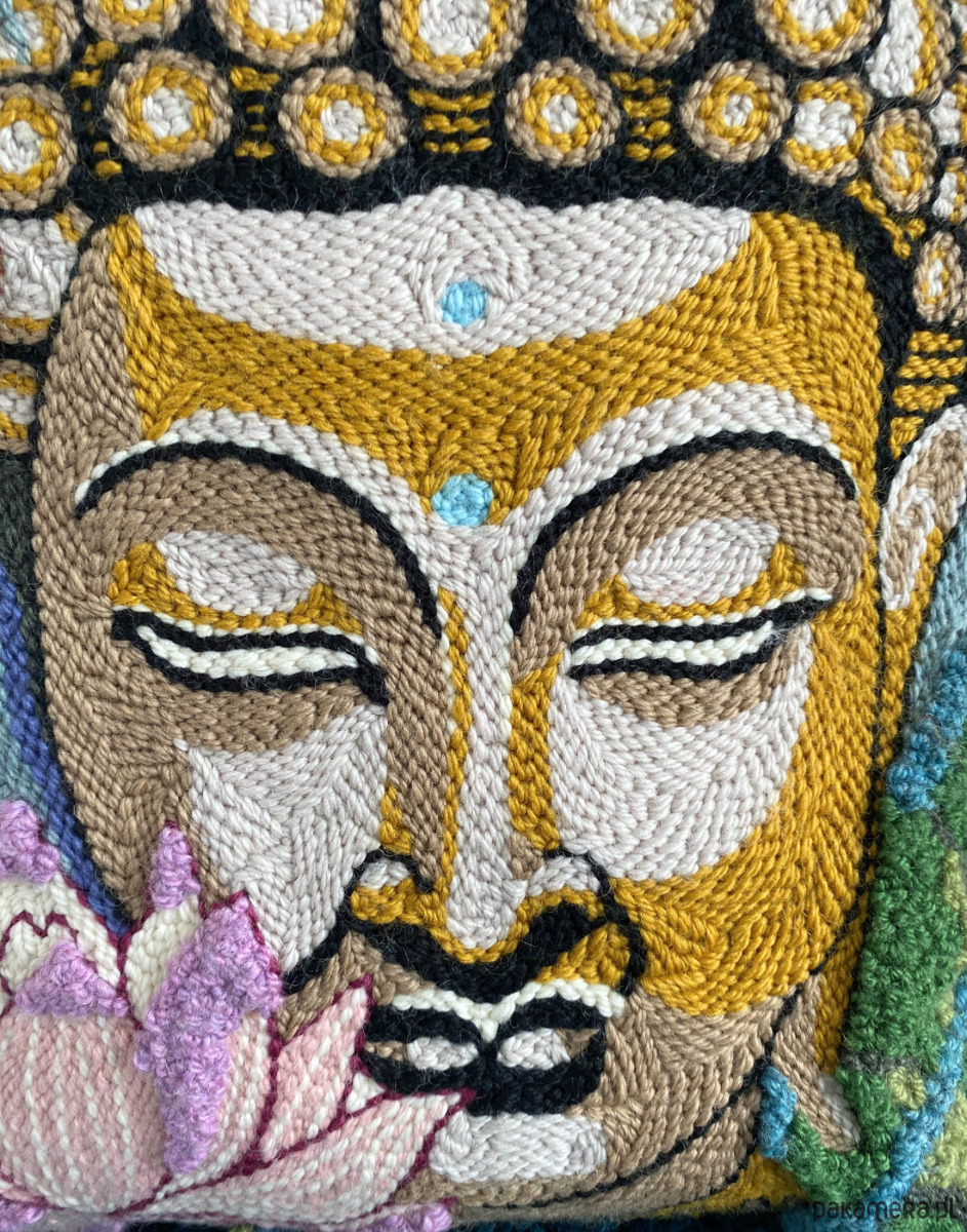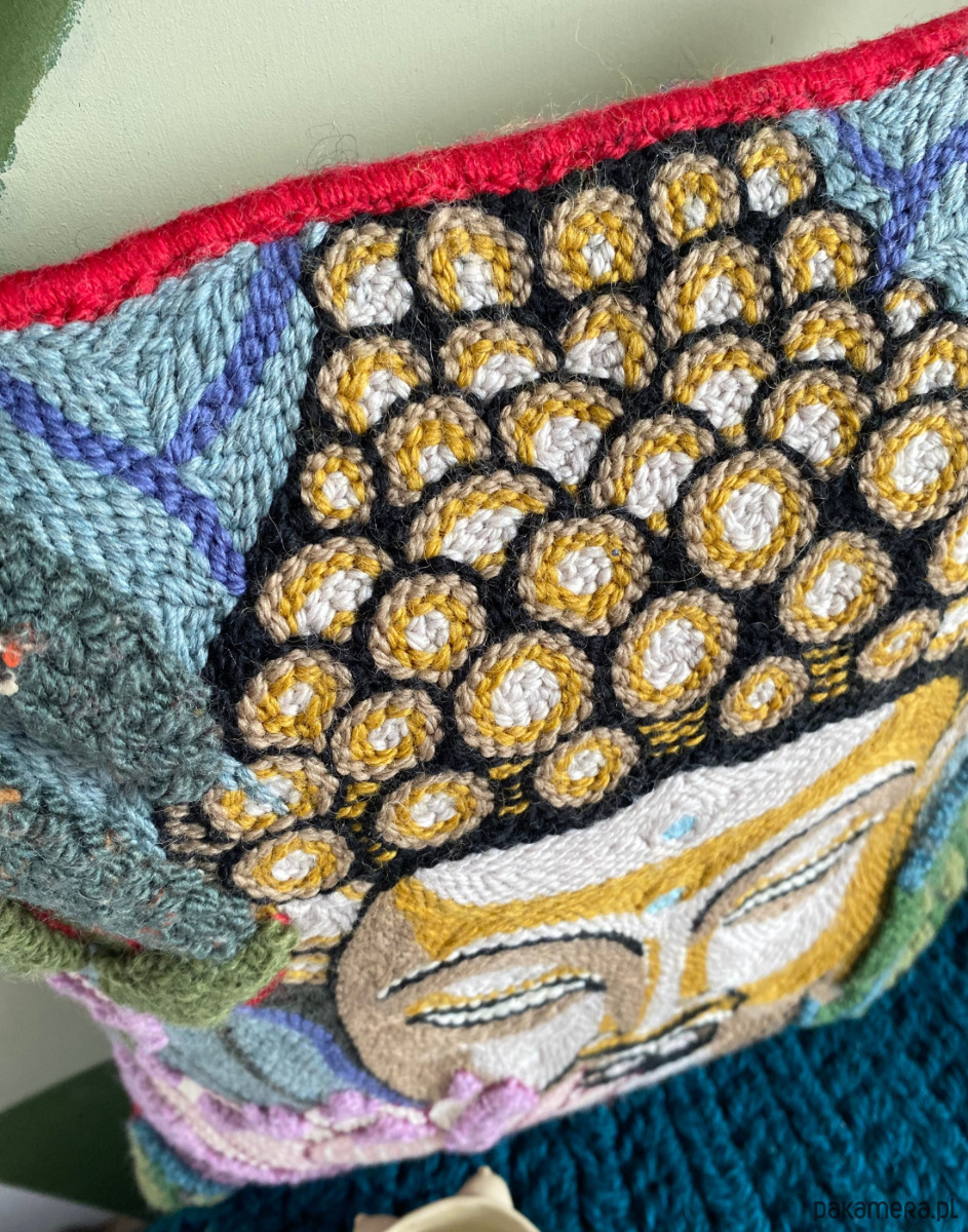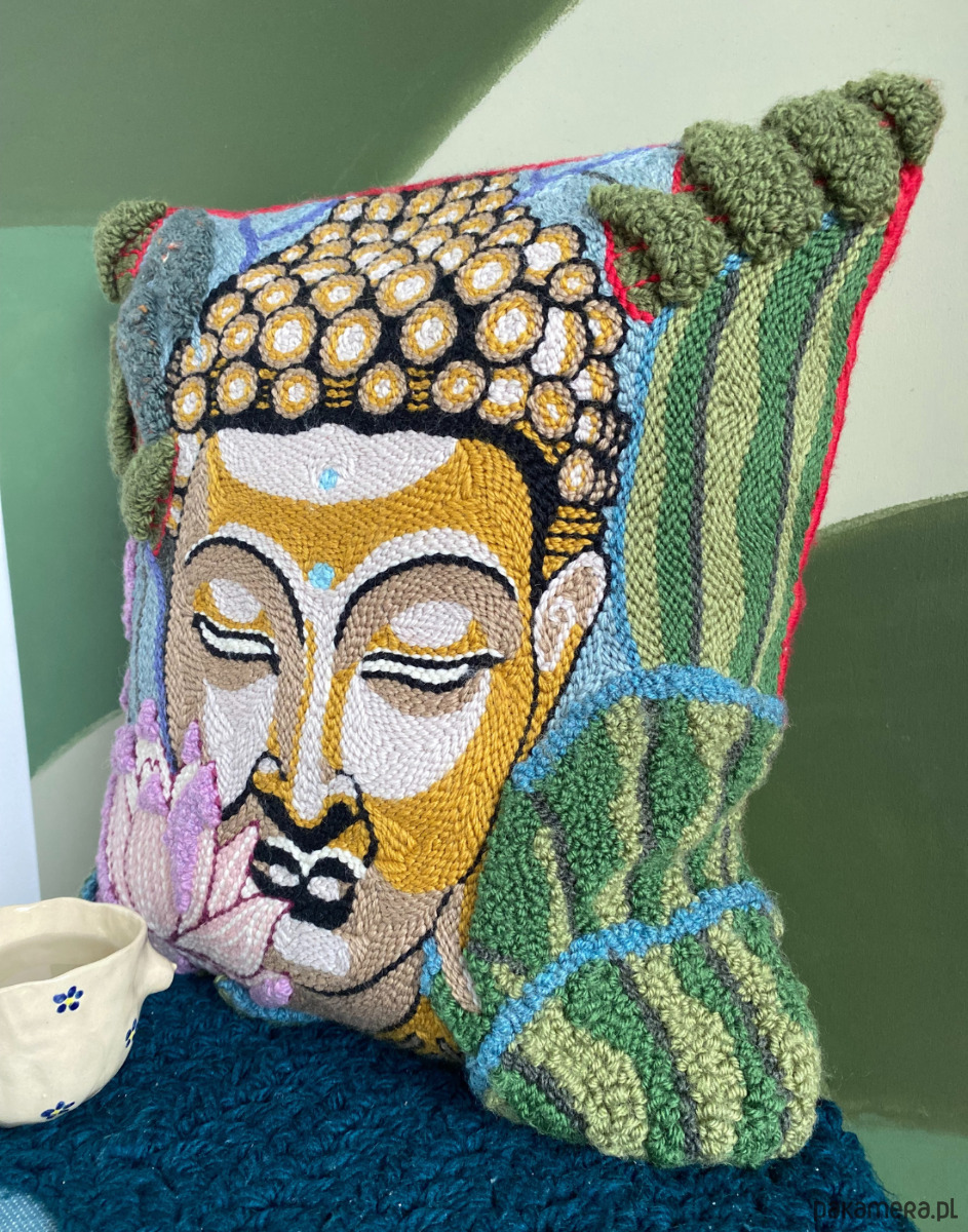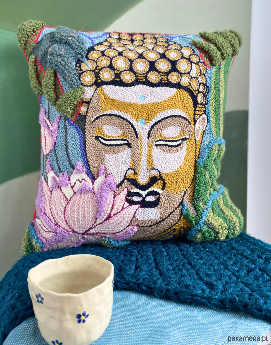 Poduszka, na której pojawia się motyw Buddy w towarzystwie niezwykłej roślinności. Ten dodatek do wnętrza mimo intensywnych kolorów ma w sobie pewien spokój i harmonię. Idealna do wnętrz, które lubią złapać balans między estetyką a funkcją, między designem a uważnością. Została wyhaftowana ręcznie techniką punch needle. To haft nazywany haftem pętelkowym, w którym główną rolę grają dekoracyjne pętelki. Przygotowana z zaangażowaniem i dbałością o najdrobniejszy detal. Jedyna w swoim rodzaju.