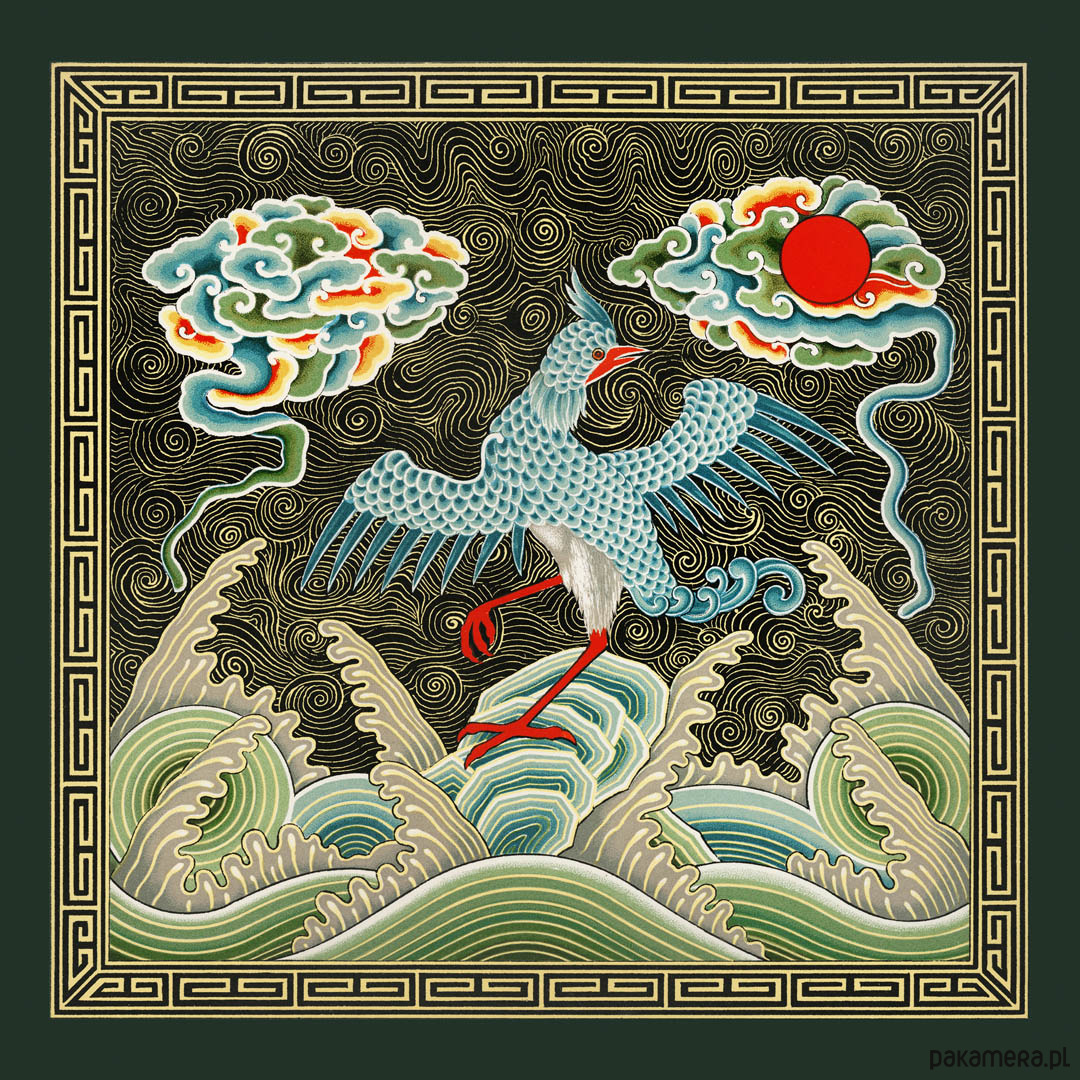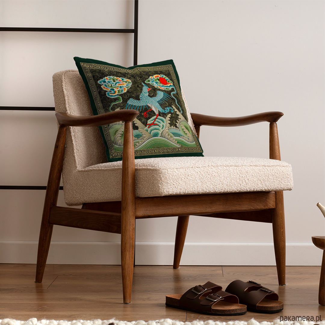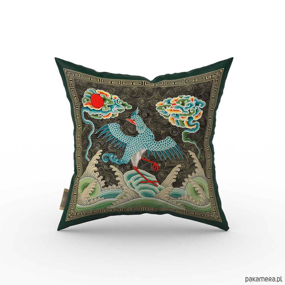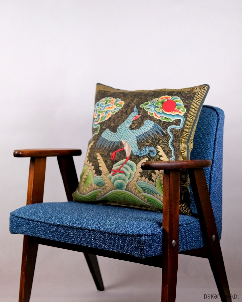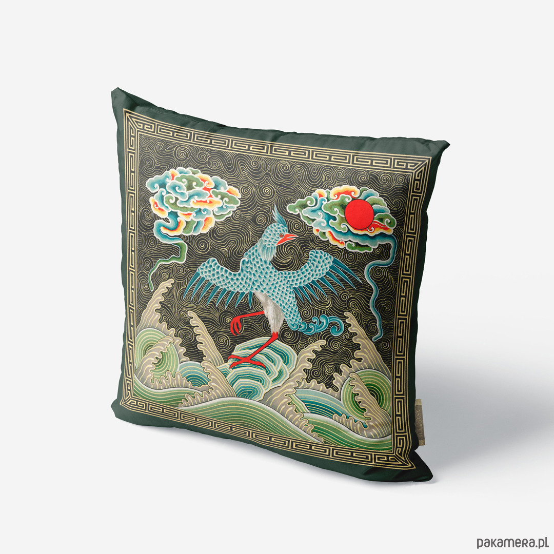 Poduszka z chińskim ptakiem na ornamentowym tle bogatym w kolory.