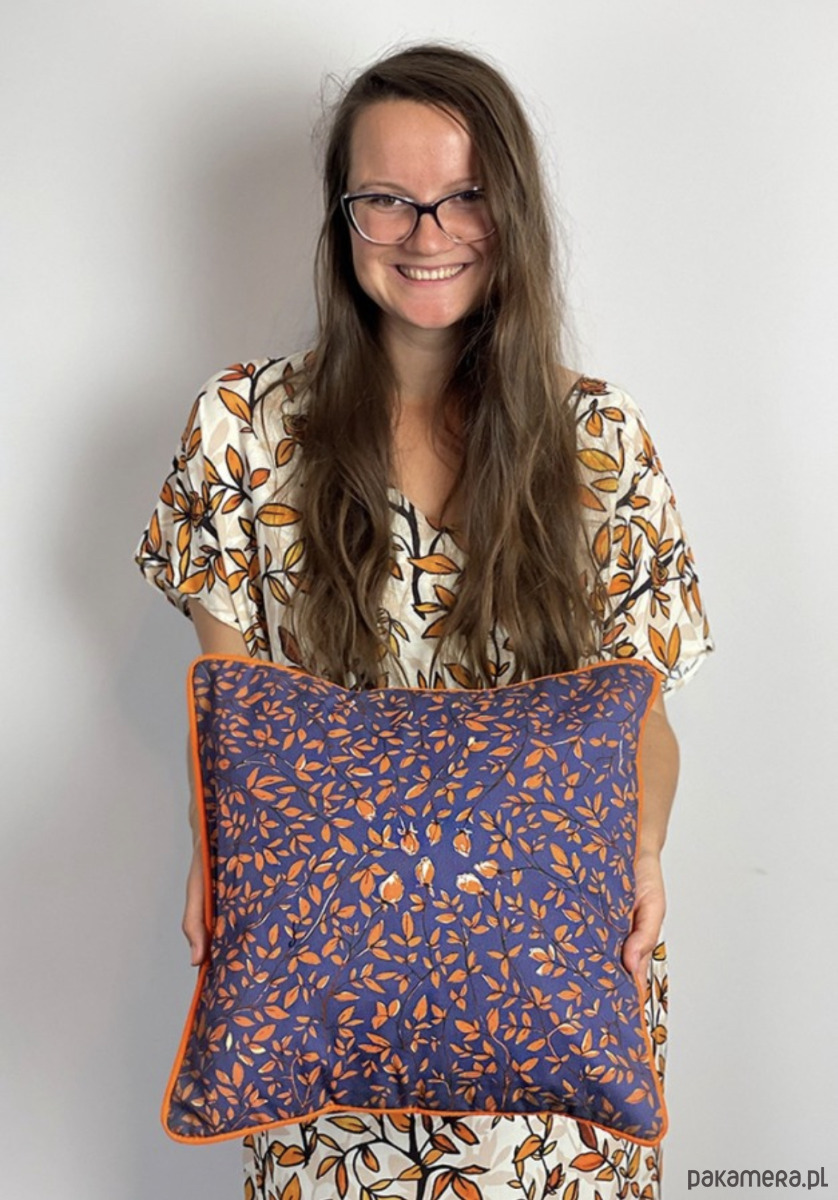 Dekoracyjne poduszki uszyte lokalnie z bawełny polskiej produkcji - każda poduszka ma specjalnie zaprojektowaną autorską grafikę dopasowaną do kwadratowego wymiaru standardowej poszewki na jaśka 40x40cm. Centralna kompozycja printu obramowana kontrastową lamówką - tył poduszki jest gładki z jednokolorowej bawełny w odcieniu pasującym do wzoru z przodu.