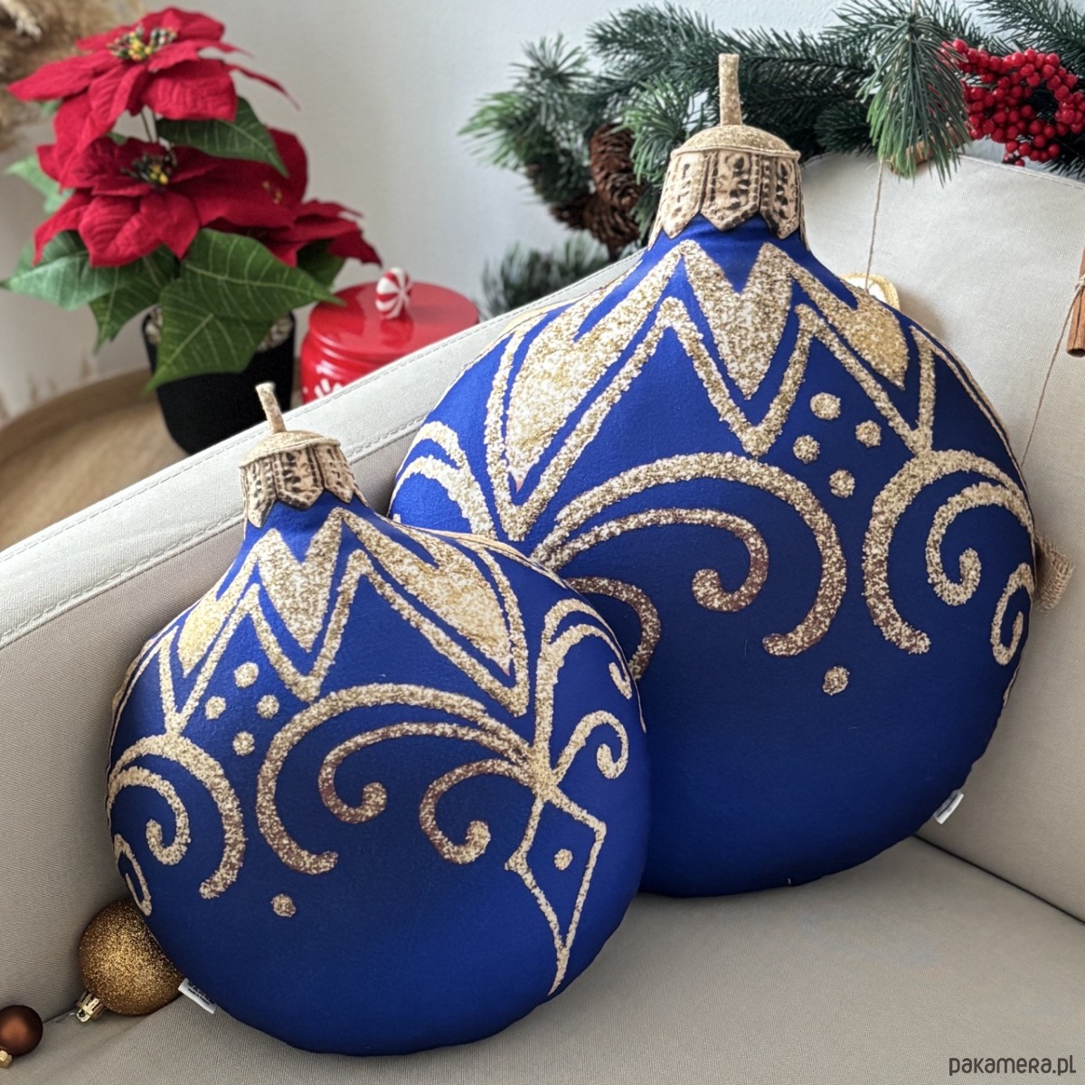 Poduszka okrągła niebieska kształcie Bombki choinkowej w stylu retro w nowoczesnym wydaniu.