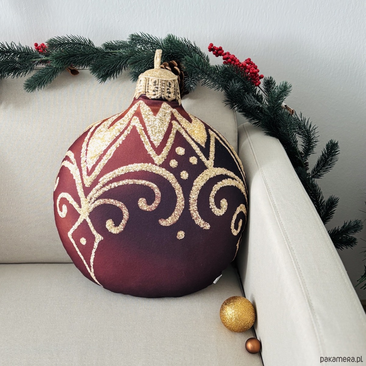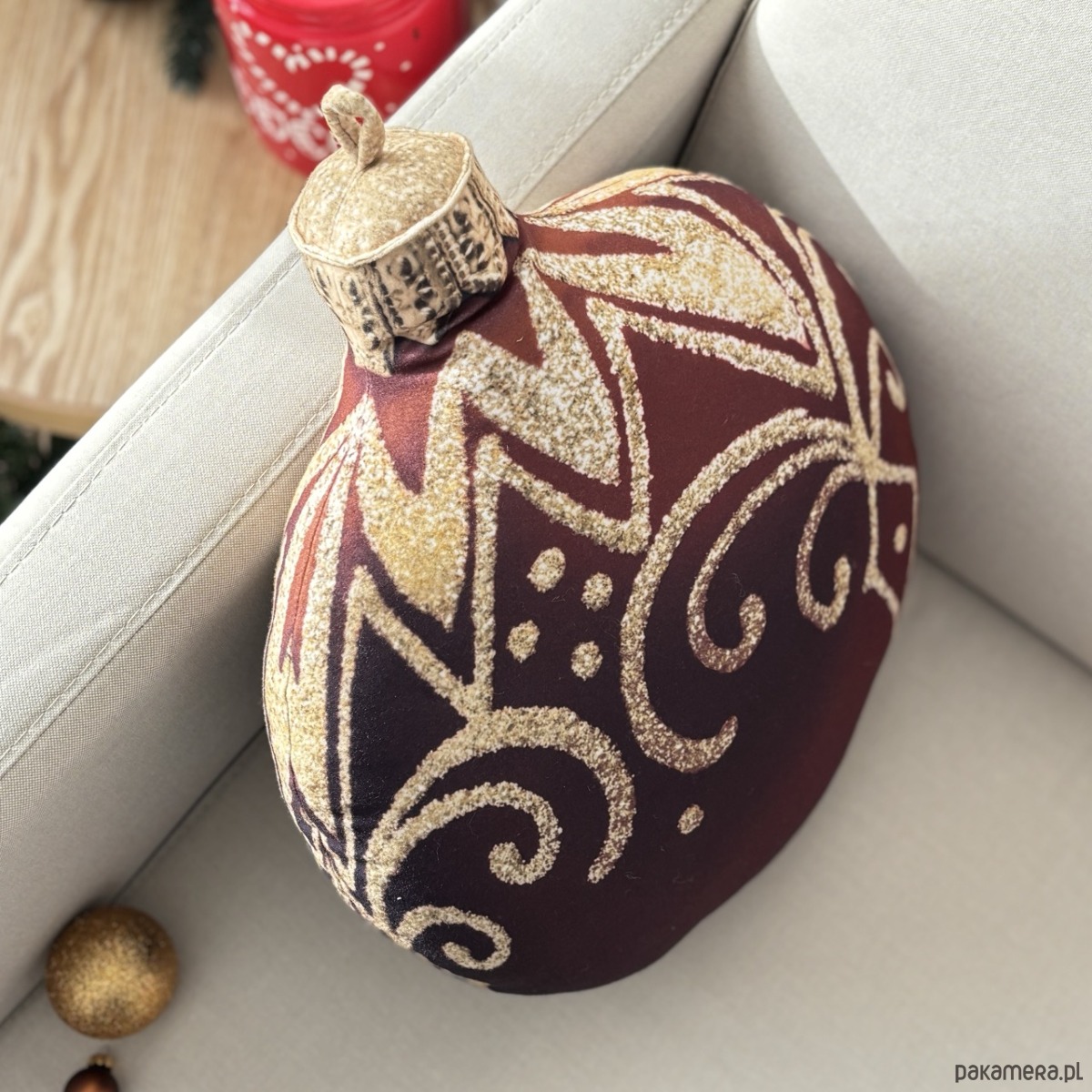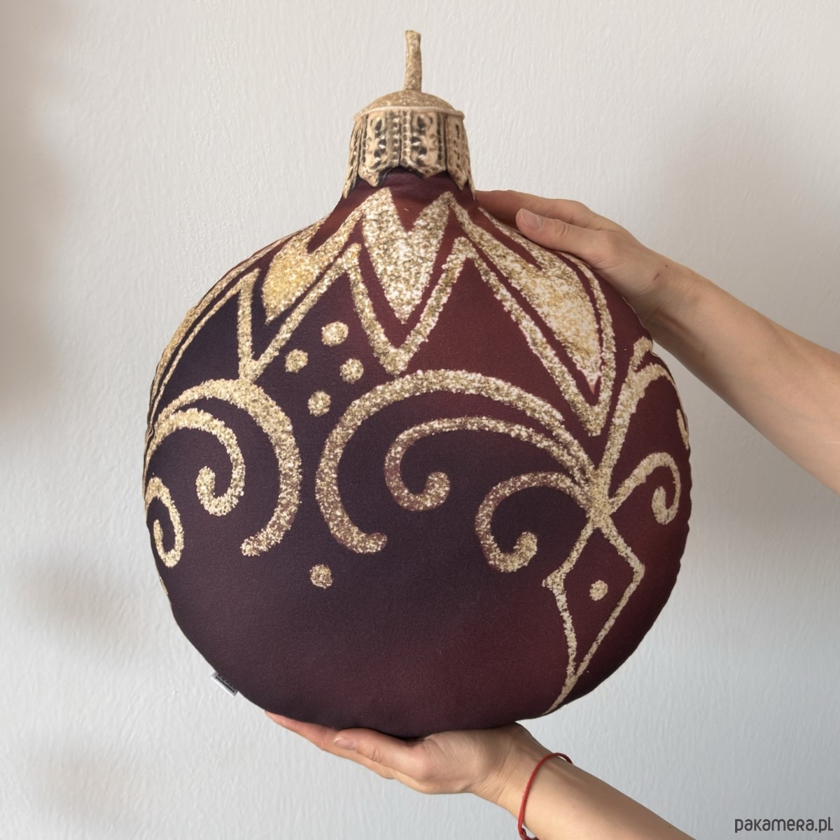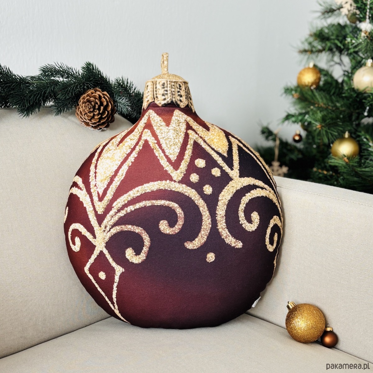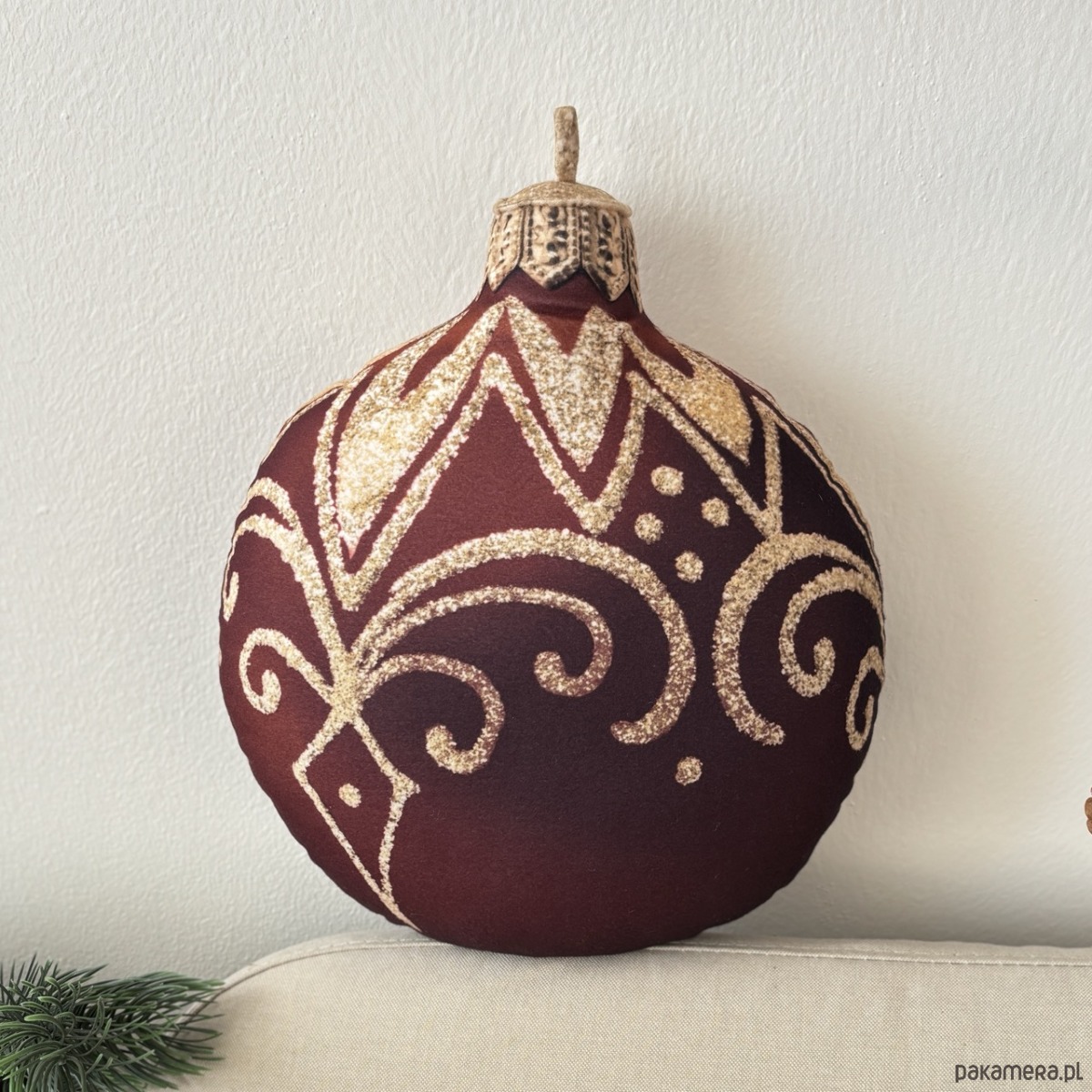 Poduszka okrągła brązowa kształcie Bombki choinkowej w stylu retro w nowoczesnym wydaniu.