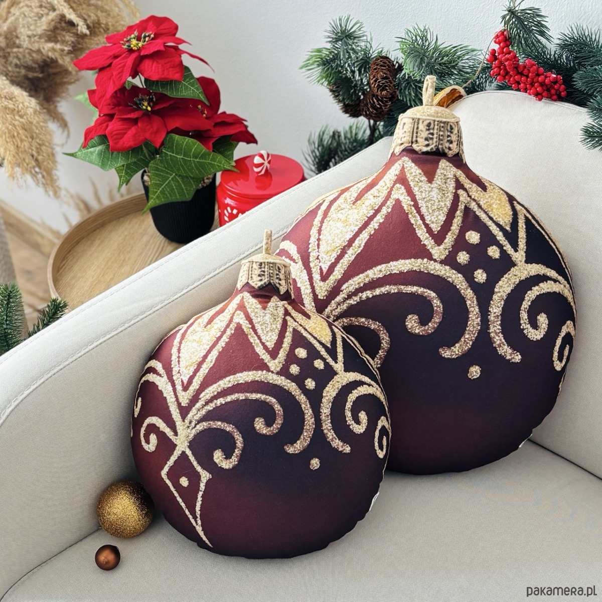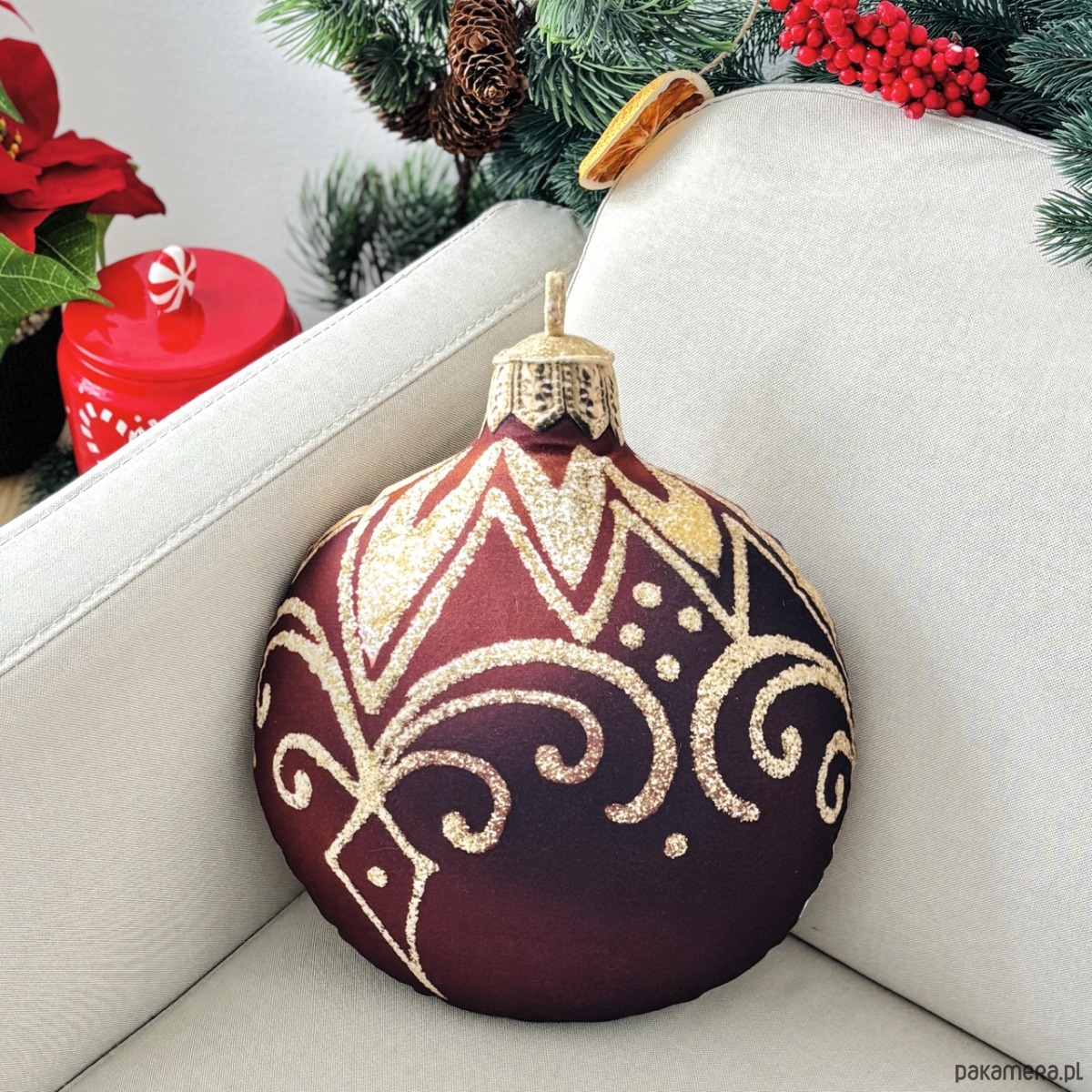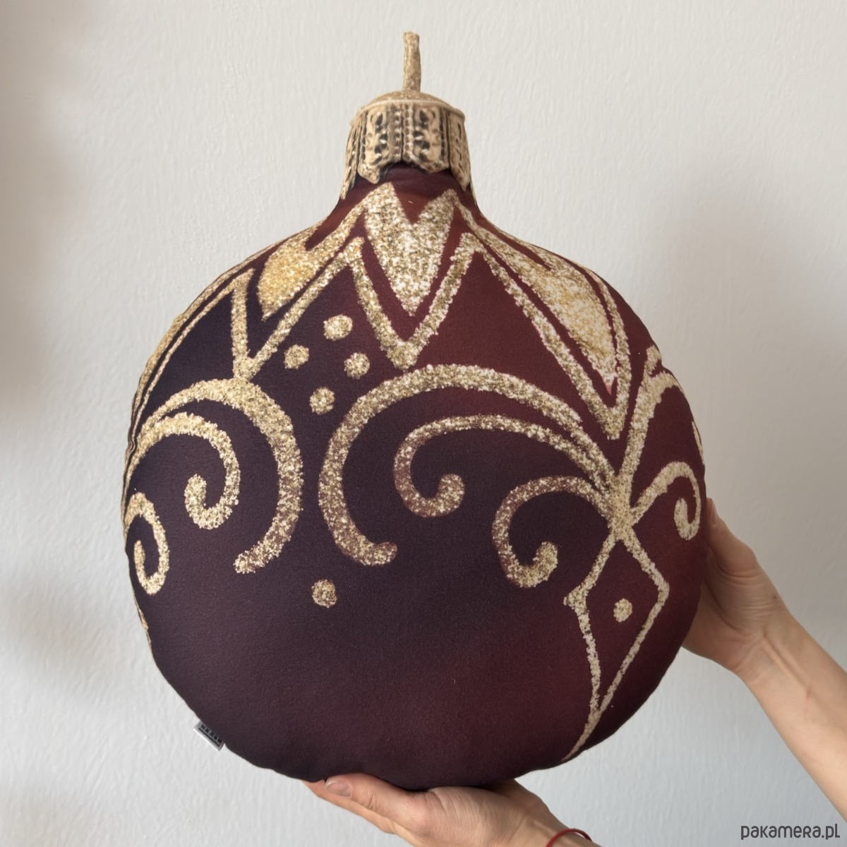 Poduszka okrągła brązowa kształcie Bombki choinkowej w stylu retro w nowoczesnym wydaniu.