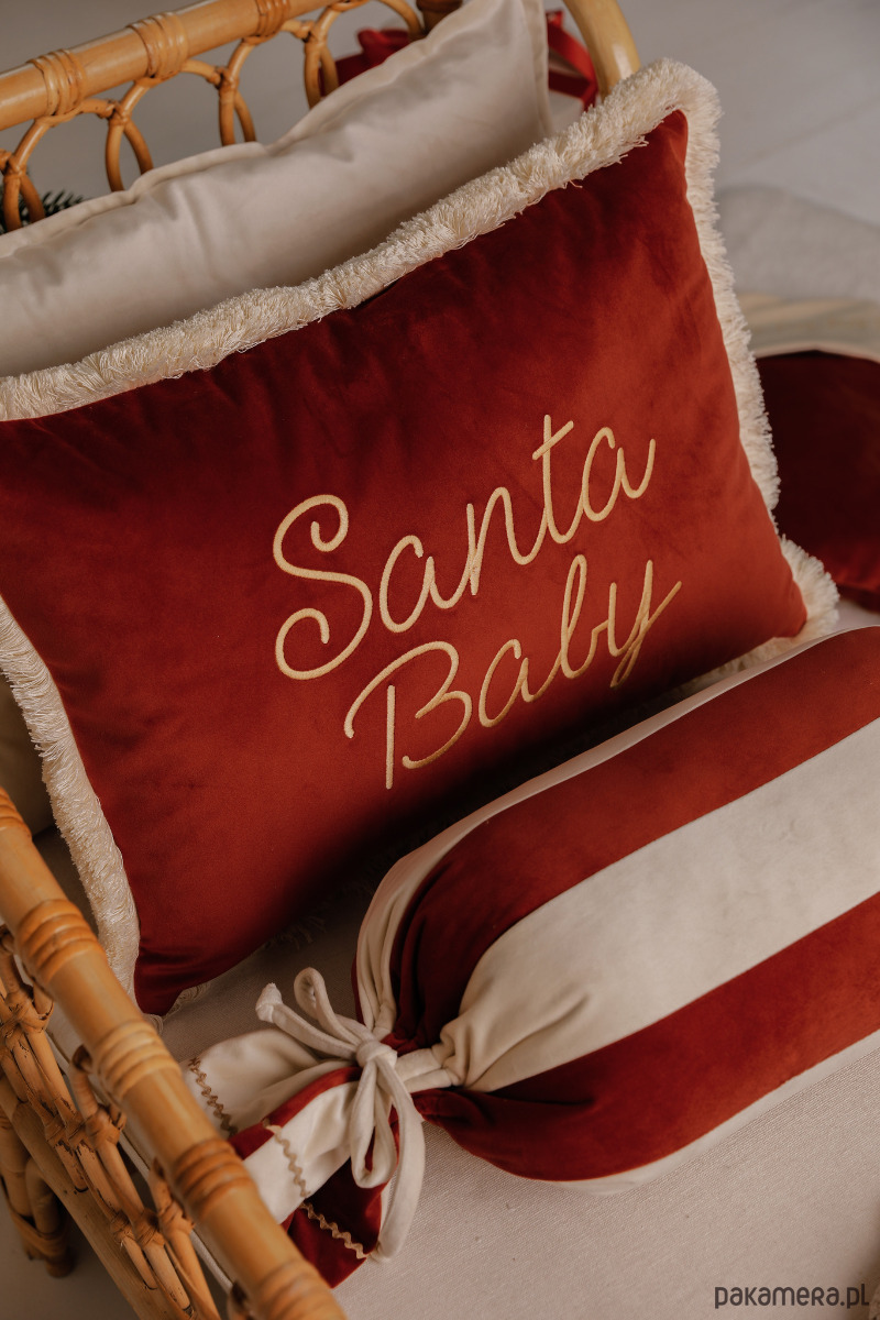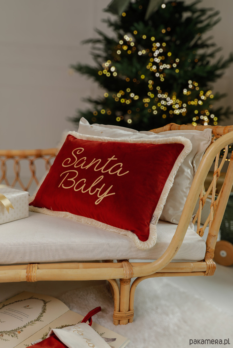 Wprowadź do swojego domu świąteczny blask i przytulny klimat z naszą personalizowaną welwetową poduszką “Santa Baby”.