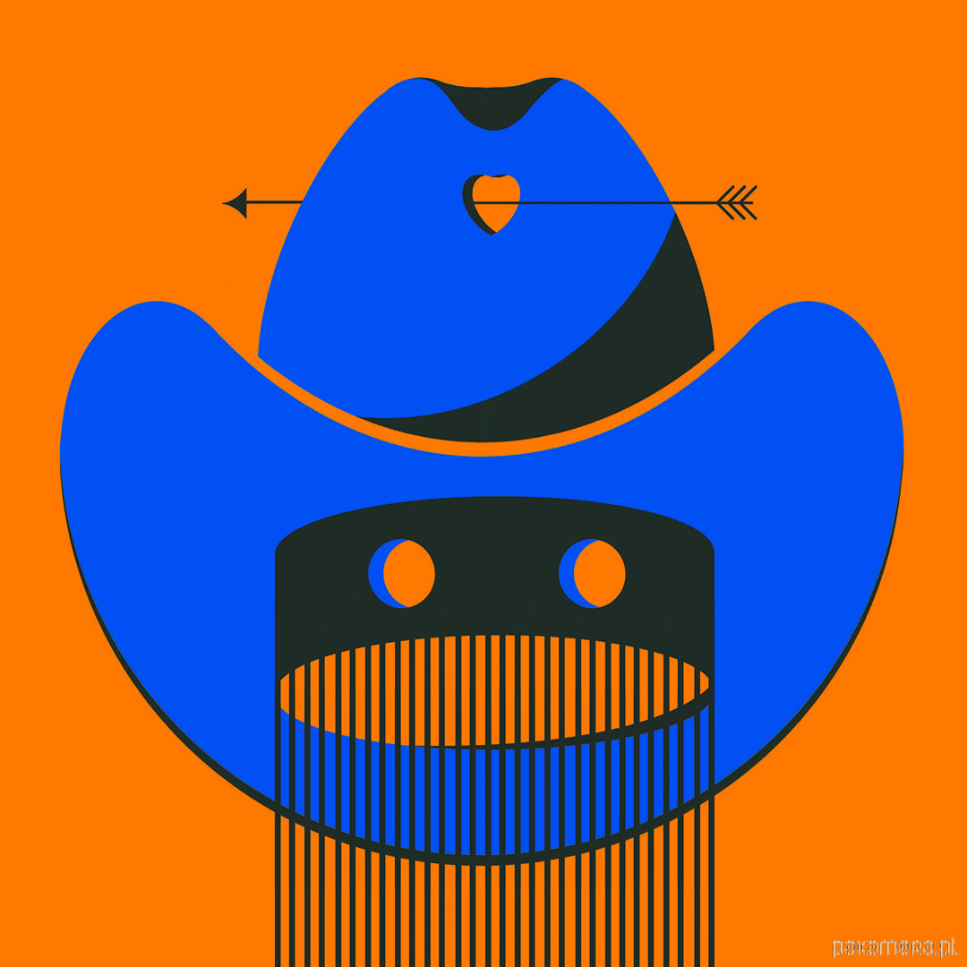 Musztardowa poduszka dekoracyjna z niebieskim kowbojskim kapeluszem. Wzór autorstwa Adama Kosika.