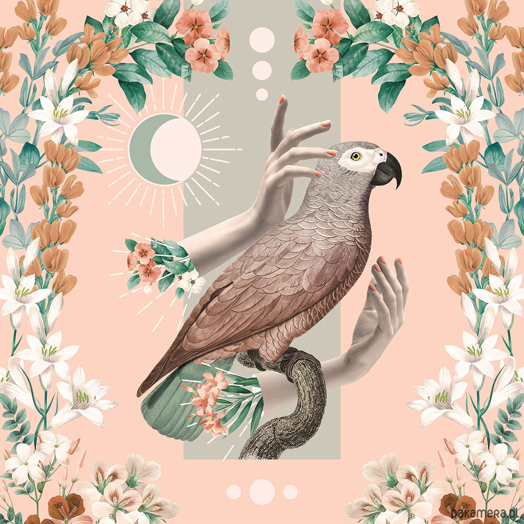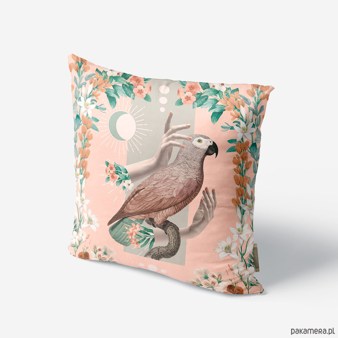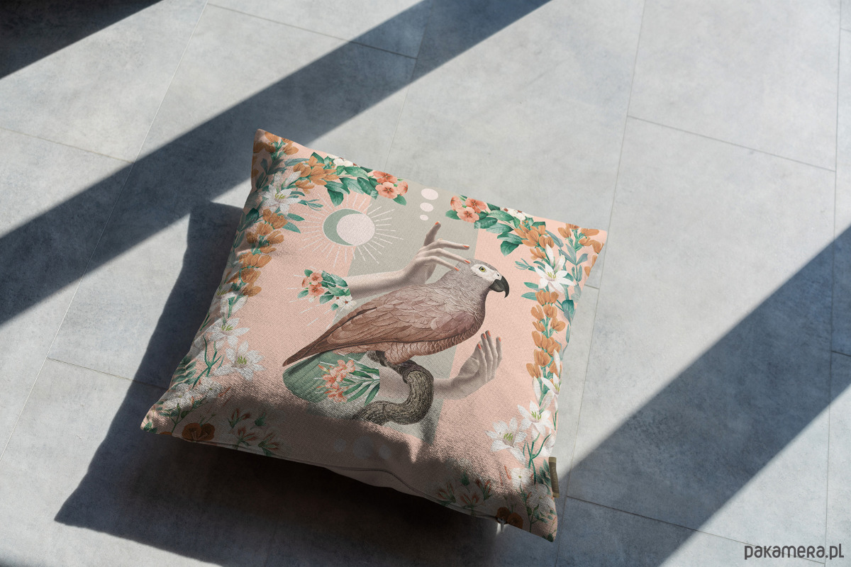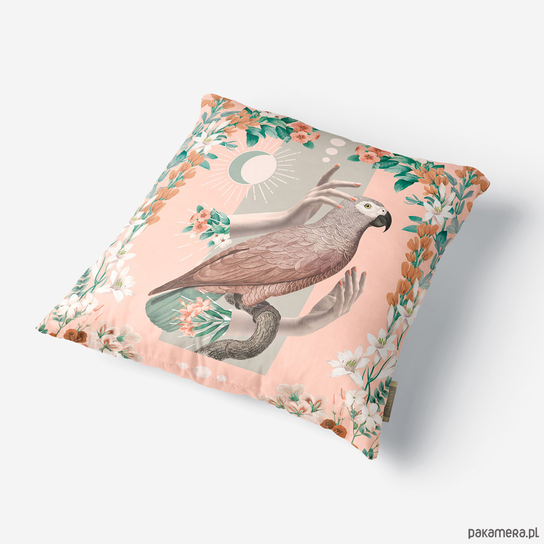 Pastelowo-różowa poduszka dekoracyjna z eleganckim wzorem kolażowym z dostojną papugą otoczoną delikatnymi kwiatami. Autorka wzoru: Agnieszka Osiecka. Oryginalna poduszka ozdobna do stylowego wnętrza, w którym będzie przyciągającym wzrok dodatkiem!