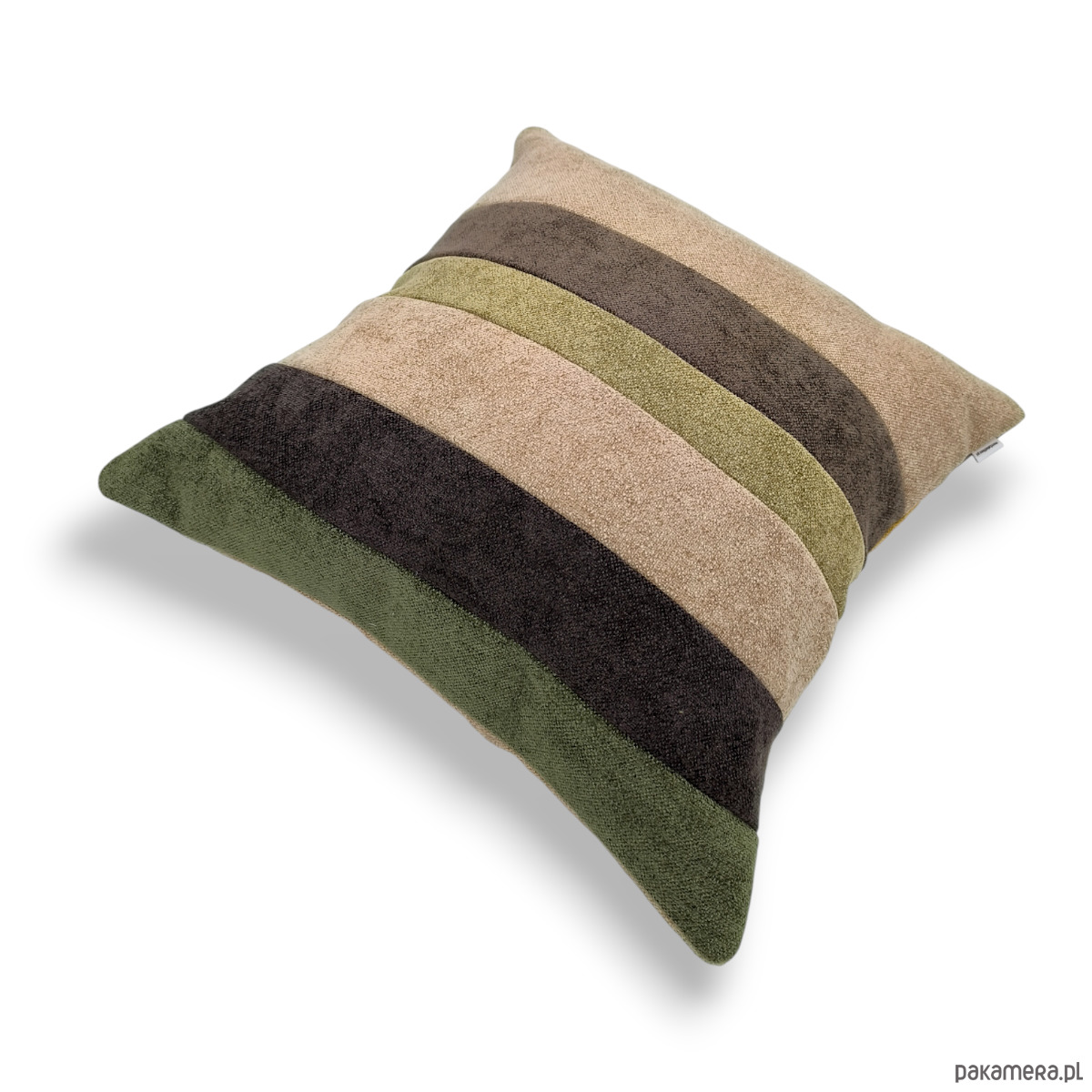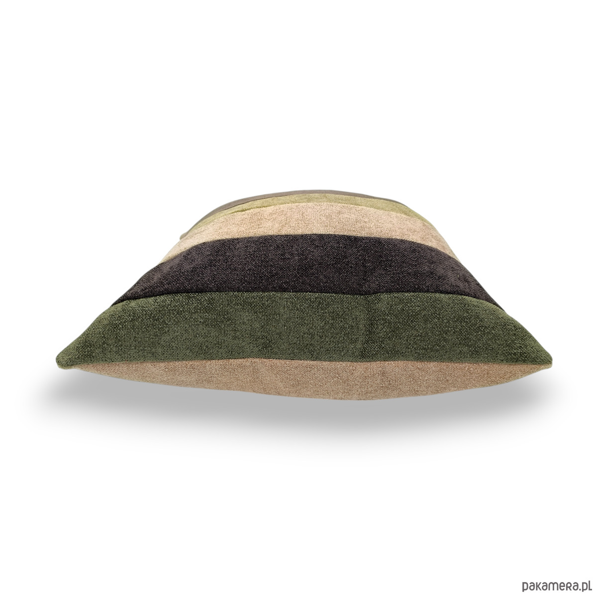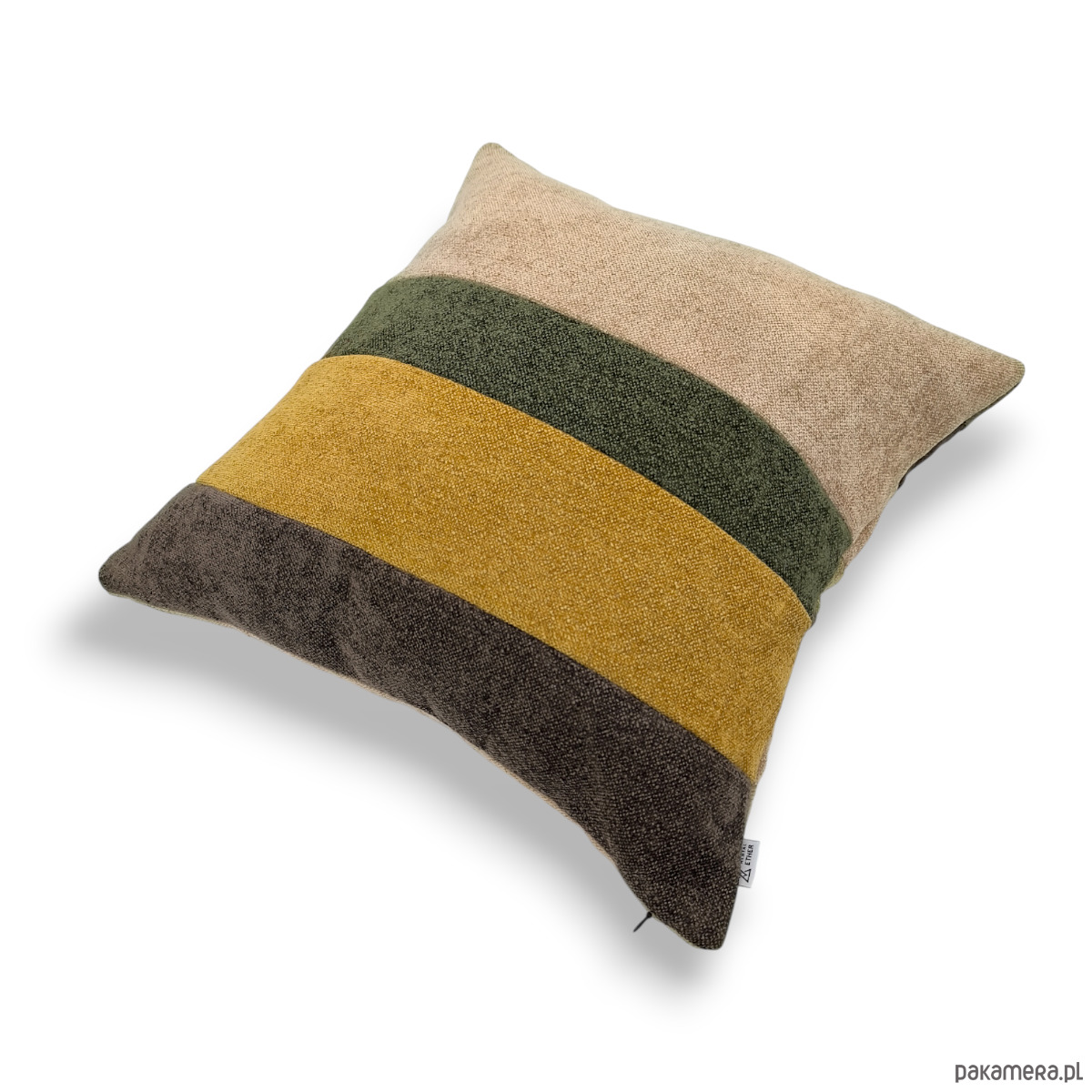 Unikalna poduszka dekoracyjna stworzona w duchu zrównoważonego rozwoju – każdy egzemplarz to drugie życie niepełnowymiarowych fragmentów certyfikowanych tkanin tapicerskich. Patchwork w szerokie, nieregularne pasy w harmonijnych kolorach: beż, brąz, ciemnozielony i musztarda.
