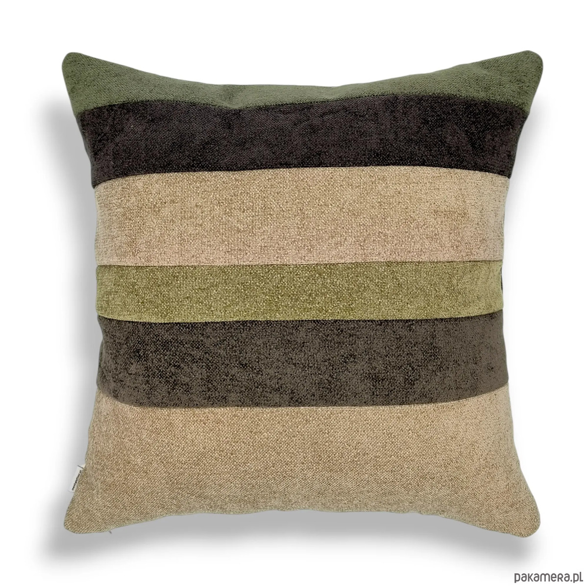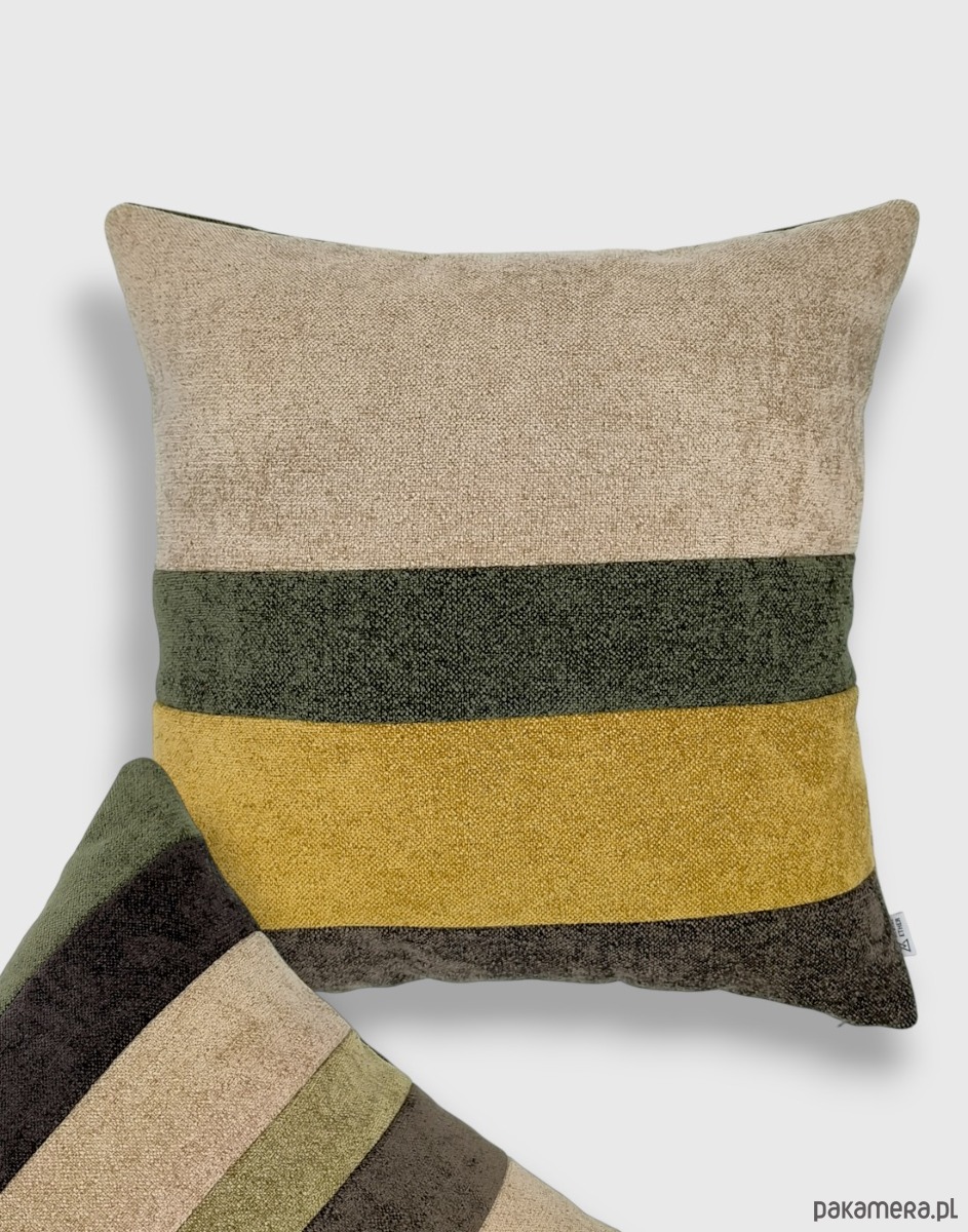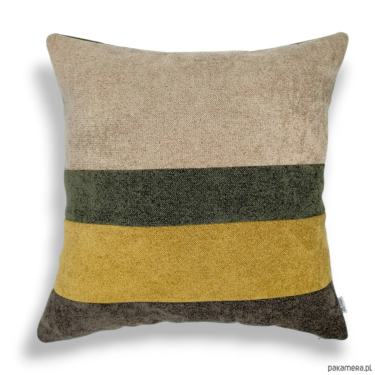 Unikalna poduszka dekoracyjna stworzona w duchu zrównoważonego rozwoju – każdy egzemplarz to drugie życie niepełnowymiarowych fragmentów certyfikowanych tkanin tapicerskich. Patchwork w szerokie, nieregularne pasy w harmonijnych kolorach: beż, brąz, ciemnozielony i musztarda.