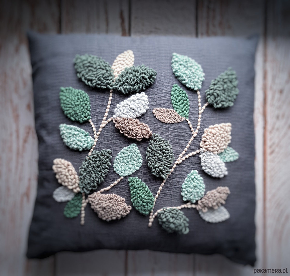 Ręcznie wykonana poduszka w technice punch needle, w stonowanych odcieniach zieleni i beżu.