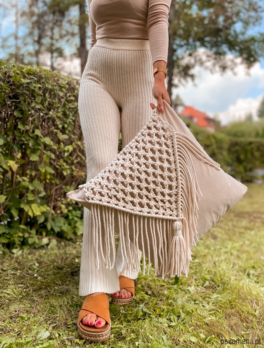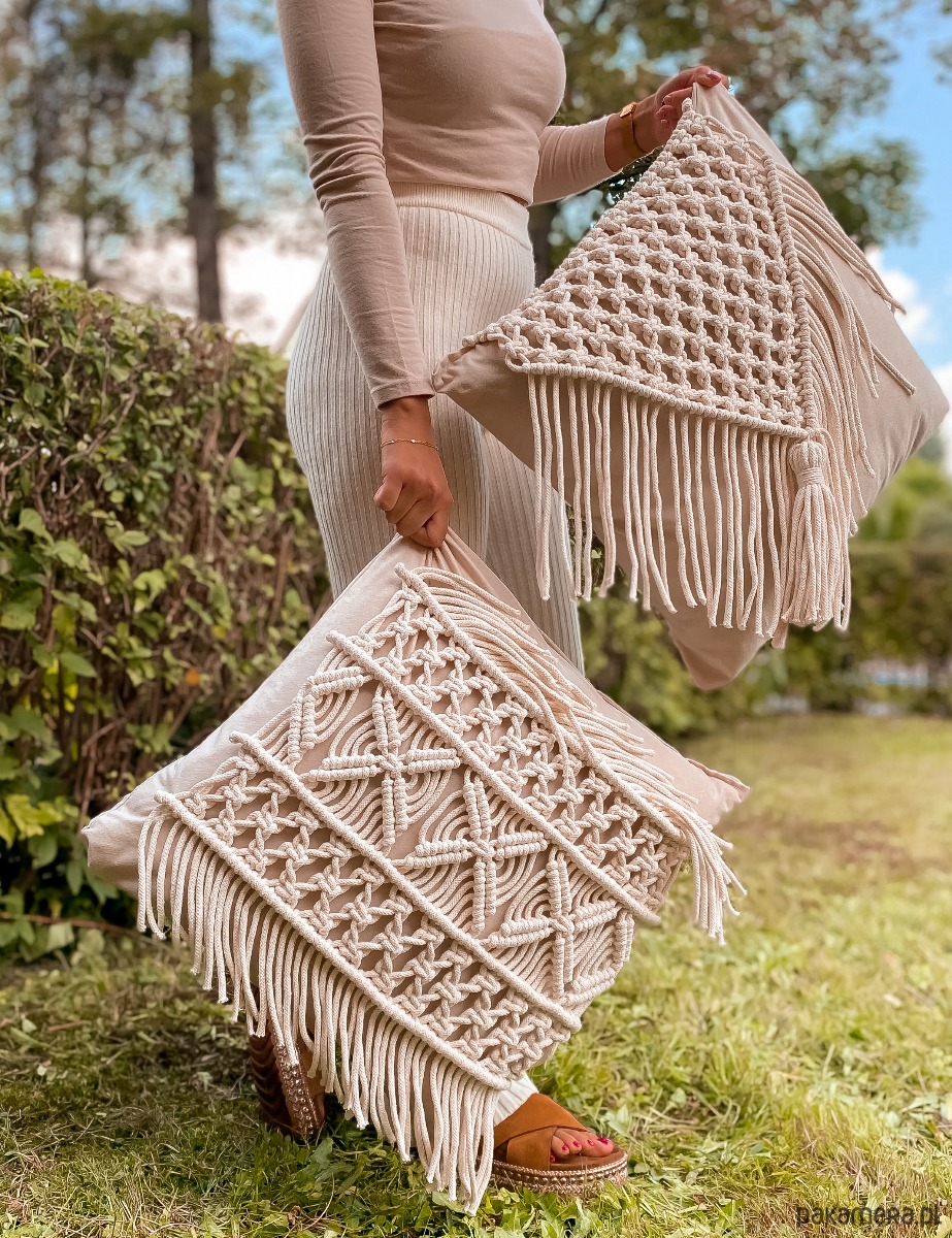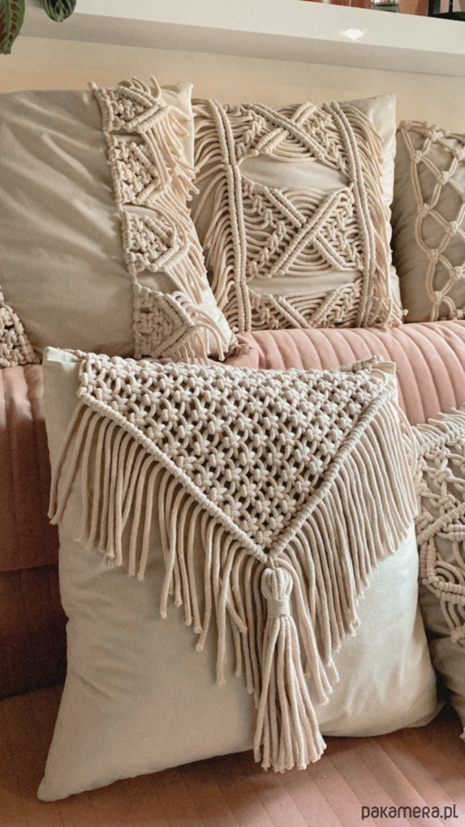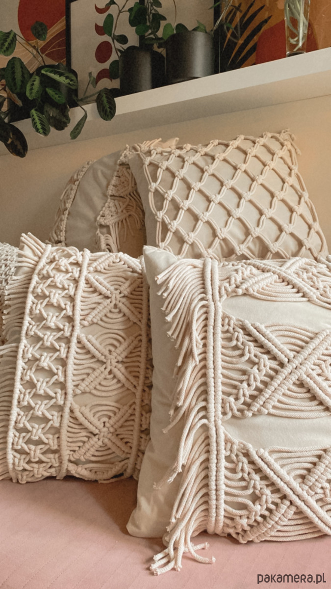 Poduchy (50x50cm) z ręcznie wyplecioną makramą z naturalnego bawełnianego sznurka 5mm z najwyższą starannością i precyzją. W każdy projekt wkładam całe serduszko i zaangażowanie.