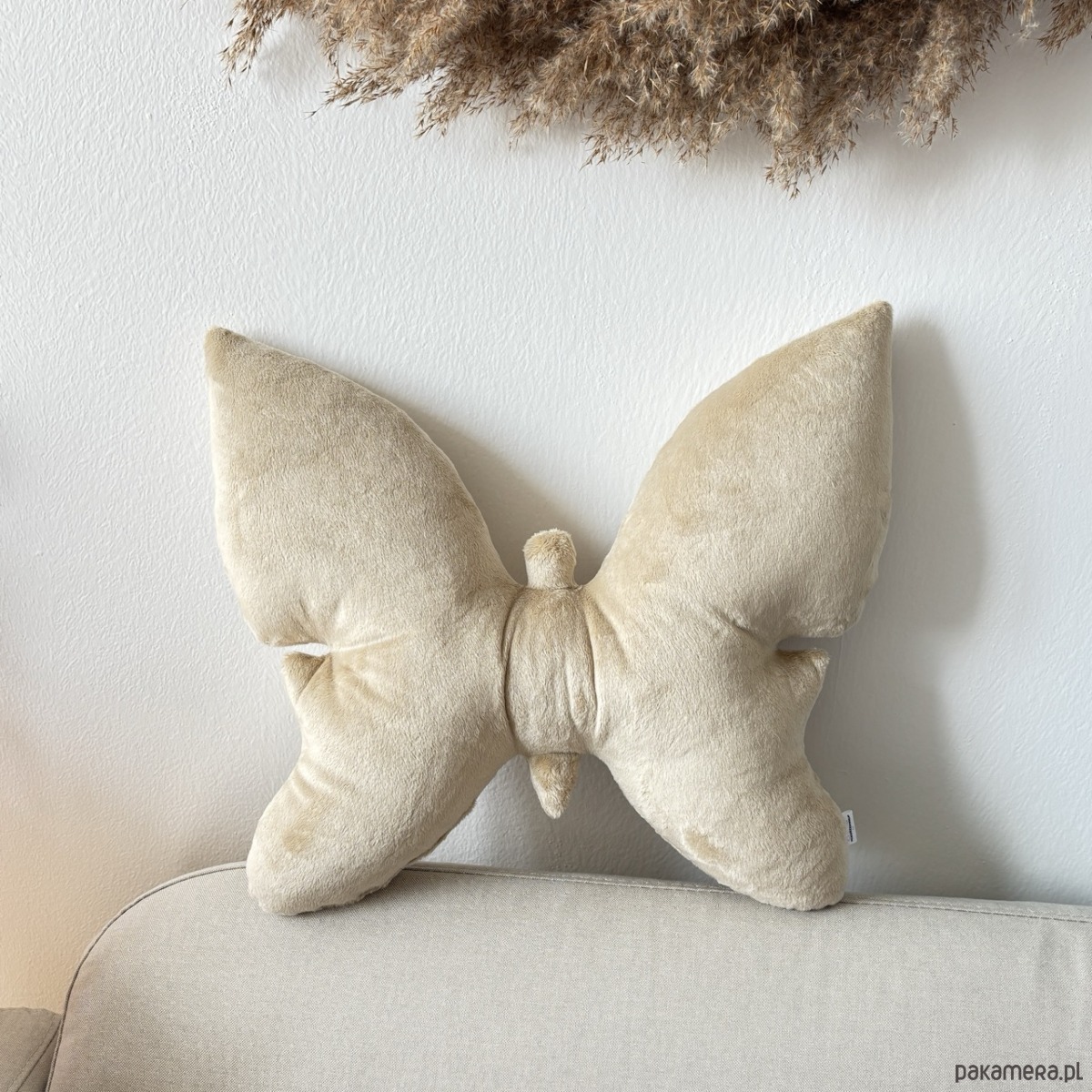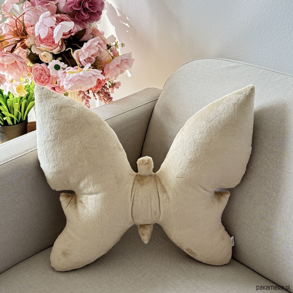 Poduszka wykonana z niezwykle miękkiej tkaniny minky plusz. Zachwyca minimalistyczną formą inspirowaną kształtem motyla oraz pięknym delikatnym kolorem jasnego beżu, który ożywia wnętrze i nadaje mu wyjątkowego charakteru. To propozycja dla osób, które lubią delikatne pastelowe akcenty w nowoczesnym wydaniu.