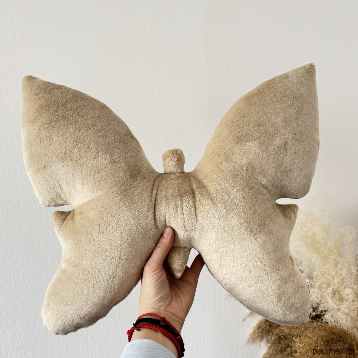 Materiał: Wykonana z wysokiej jakości tkaniny minky plusz (poliester). Materiał jest wyjątkowo miękki, aksamitny w dotyku i przyjemnie otulający. Poduszka jest dwustronna – przód i tył prezentują estetyczne, staranne wykończenie. Tkanina jest sprężysta, delikatna dla skóry i pięknie układa się w formie motyla.