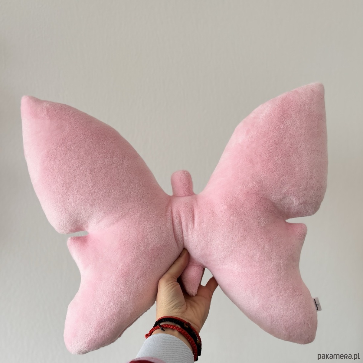 Materiał: Wykonana z wysokiej jakości tkaniny minky plusz (poliester). Materiał jest wyjątkowo miękki, aksamitny w dotyku i przyjemnie otulający. Poduszka jest dwustronna – przód i tył prezentują estetyczne, staranne wykończenie. Tkanina jest sprężysta, delikatna dla skóry i pięknie układa się w formie motyla.