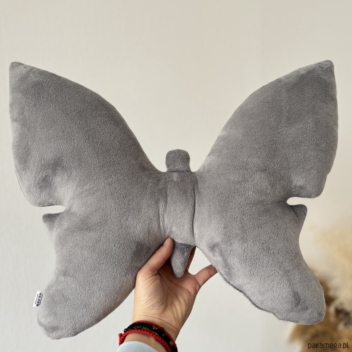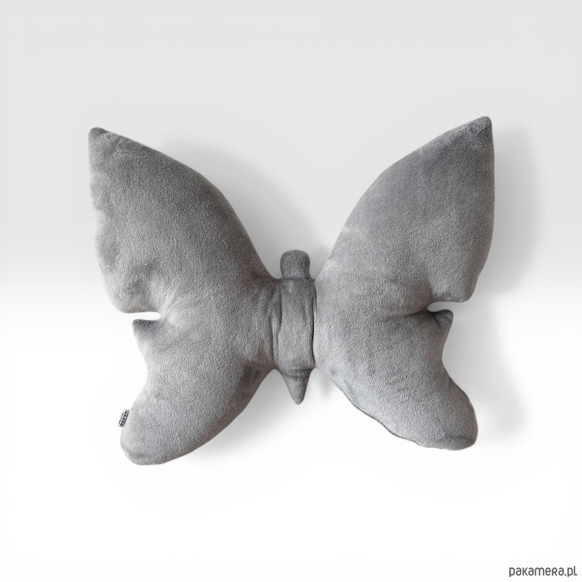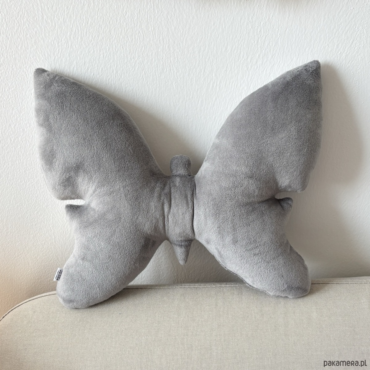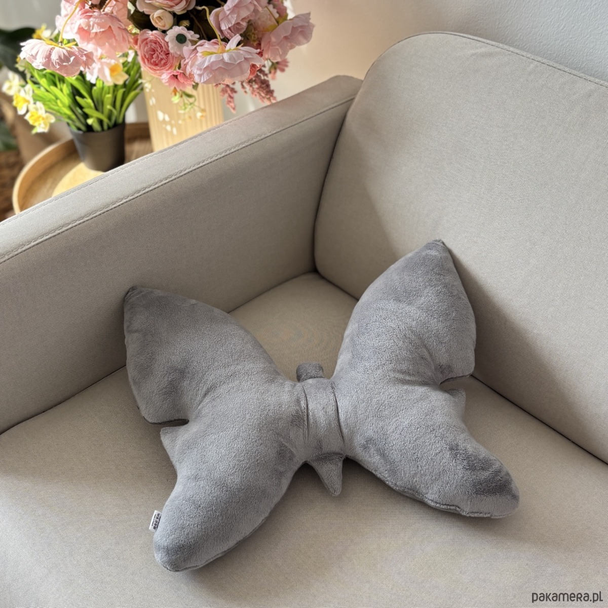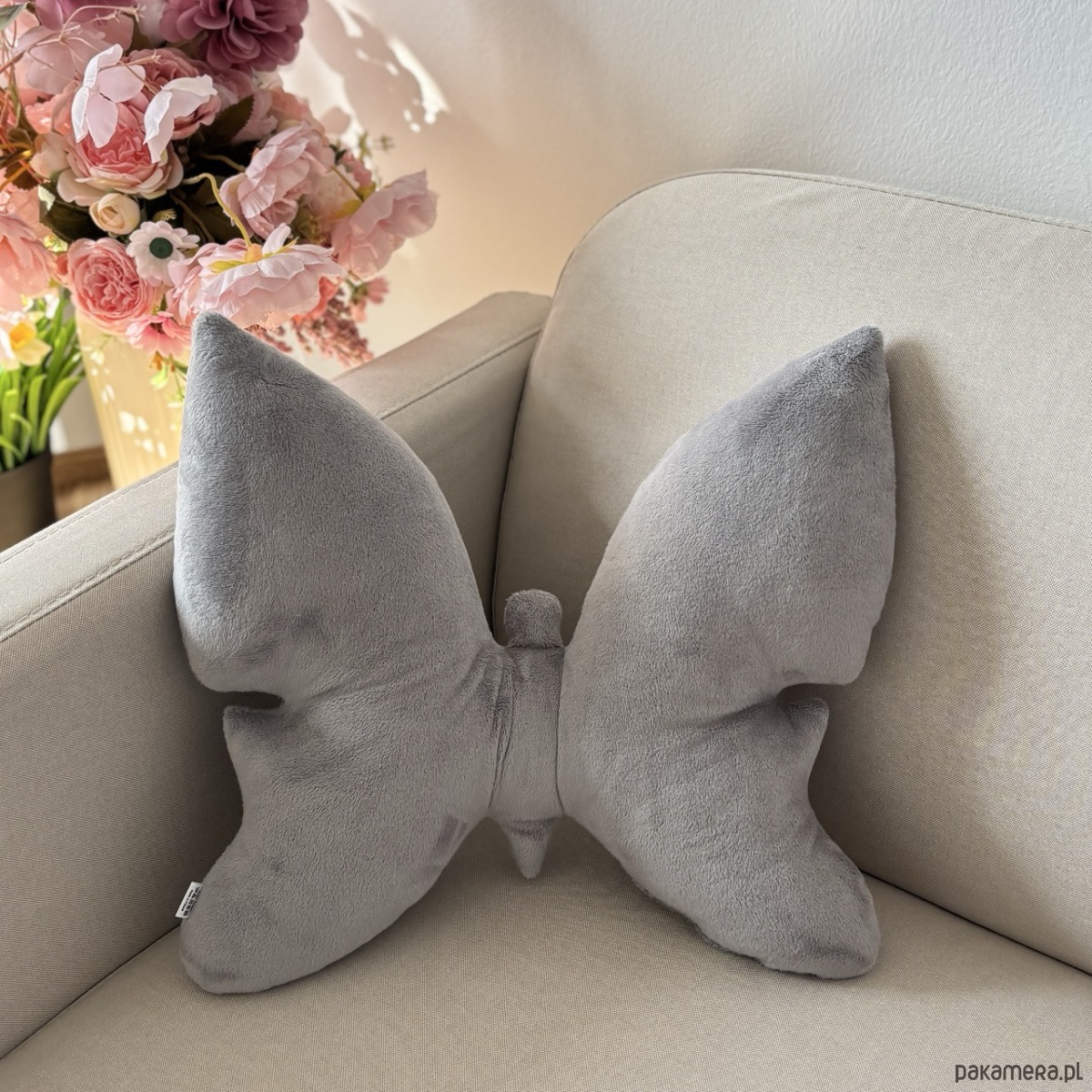 Poduszka wykonana z niezwykle miękkiej tkaniny minky plusz. Zachwyca minimalistyczną formą inspirowaną kształtem motyla oraz pięknym delikatnym kolorem szarym, który ożywia wnętrze i nadaje mu wyjątkowego charakteru. To propozycja dla osób, które lubią delikatne pastelowe akcenty w nowoczesnym wydaniu.