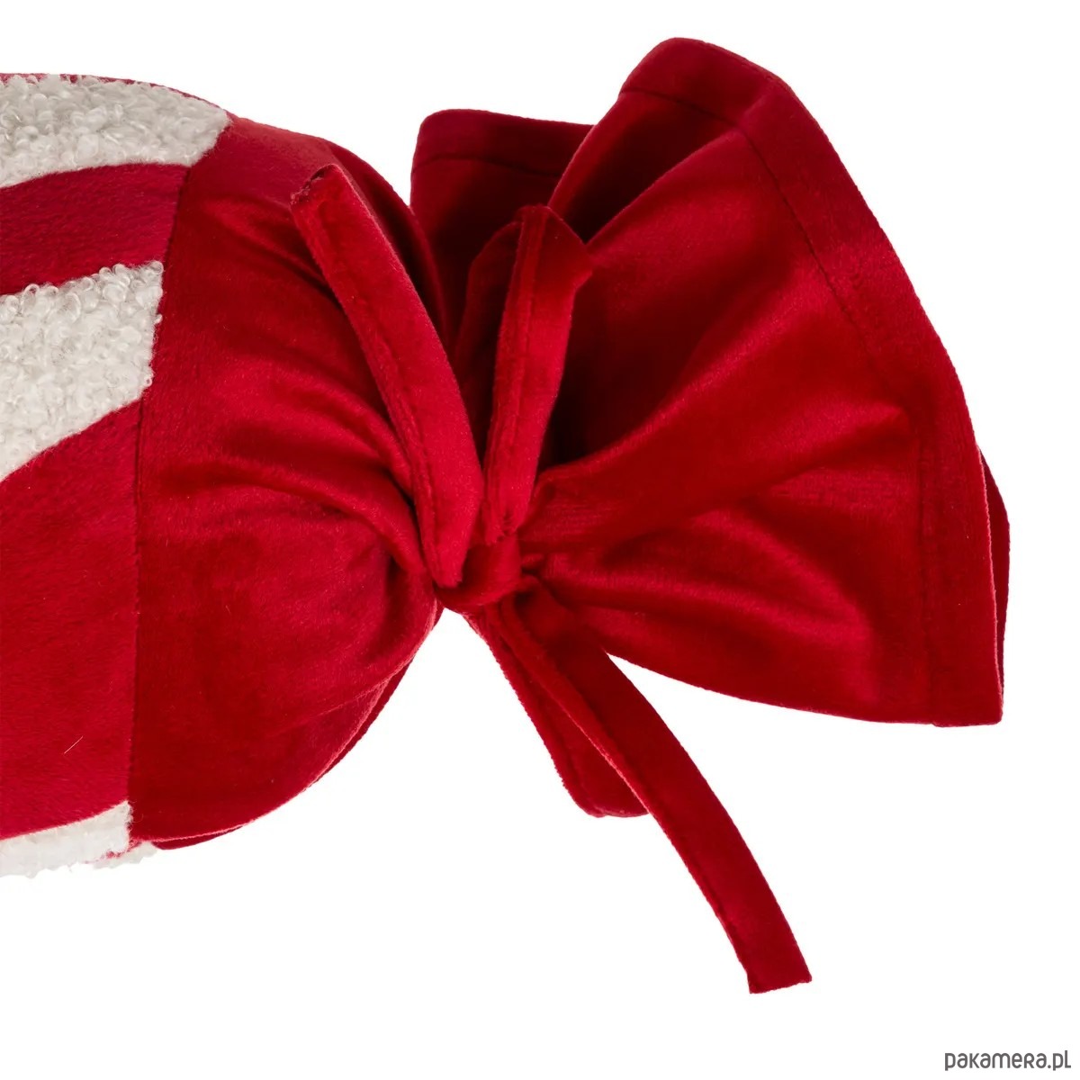 Poduszka dekoracyjna świąteczna w kształcie cukierka. Wykonana z tkaniny aksamitnej oraz bouclé. Utrzymana w kolorze białym i czerwonym.